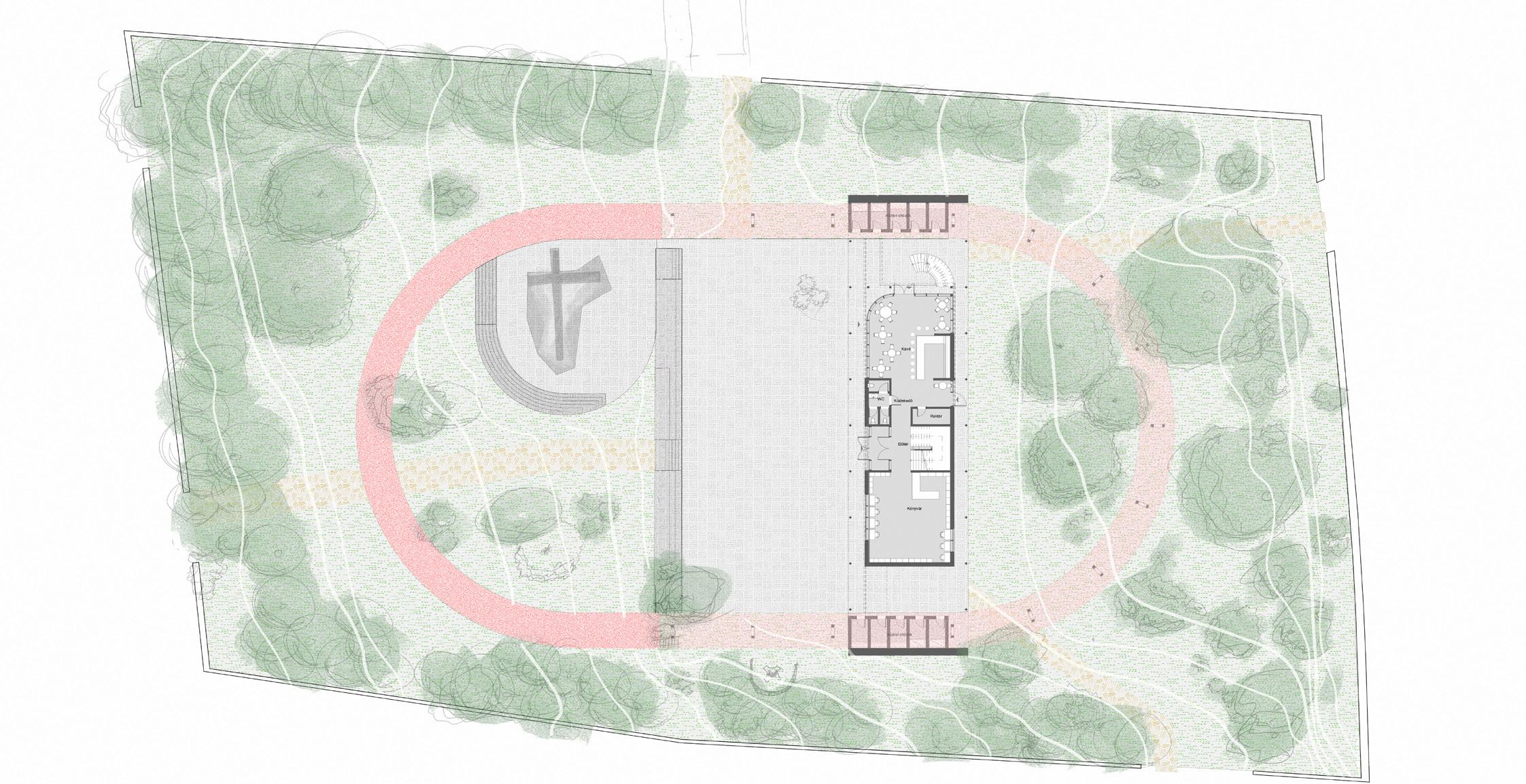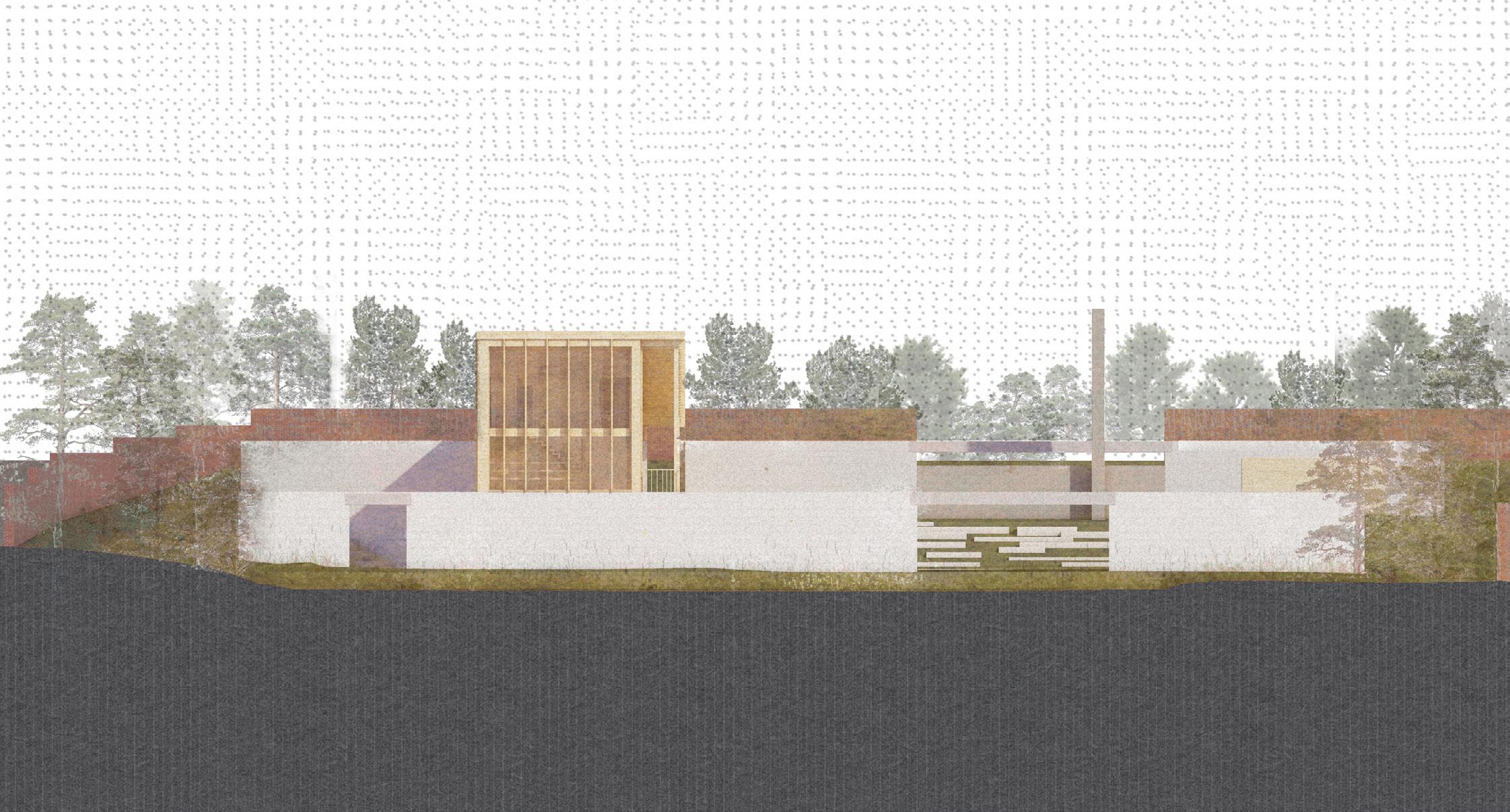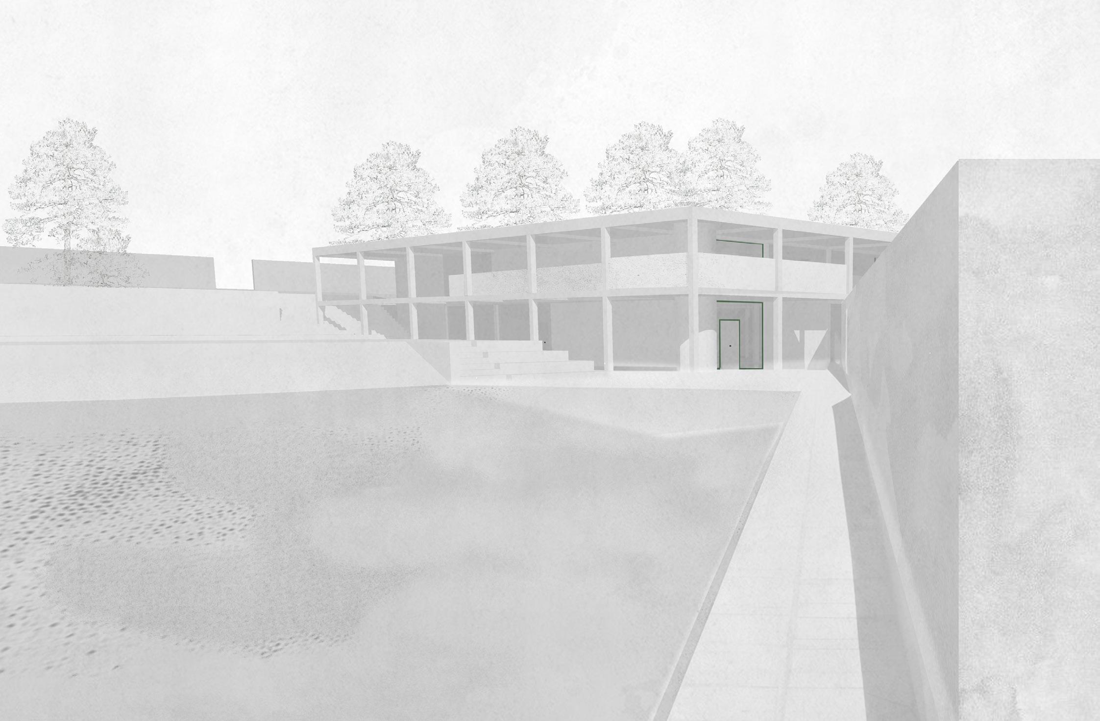 A műemlék megtartása és a tervezésbe való bevonása volt az egyik fő célom. Annak méreteiből és arányrendszeréből kialakítottam egy raszterrendszert, amihez igazodva állapítottam meg az építési területet, az épület arányait és szerkezei kiosztását. Az épület telepítését ezért a műemlék mögé helyeztem el, a hozzá tartozó építési területet vele azonos szintre süllyesztettem. Ezt a területet támfalakkal kerítettem körbe, amivel épületek határfalai nem érintkeznek, a kijelölt területen szabadon állnak. Az épületek a műemlékkel egy privátabb belső teret jelölnek mi, ahova szabadom kitudnak szerveződni a benti programok, és dinamikus kapcsolatban áll a külső fedett-nyitott terekkel.