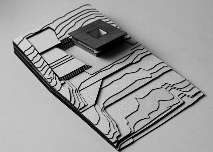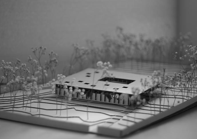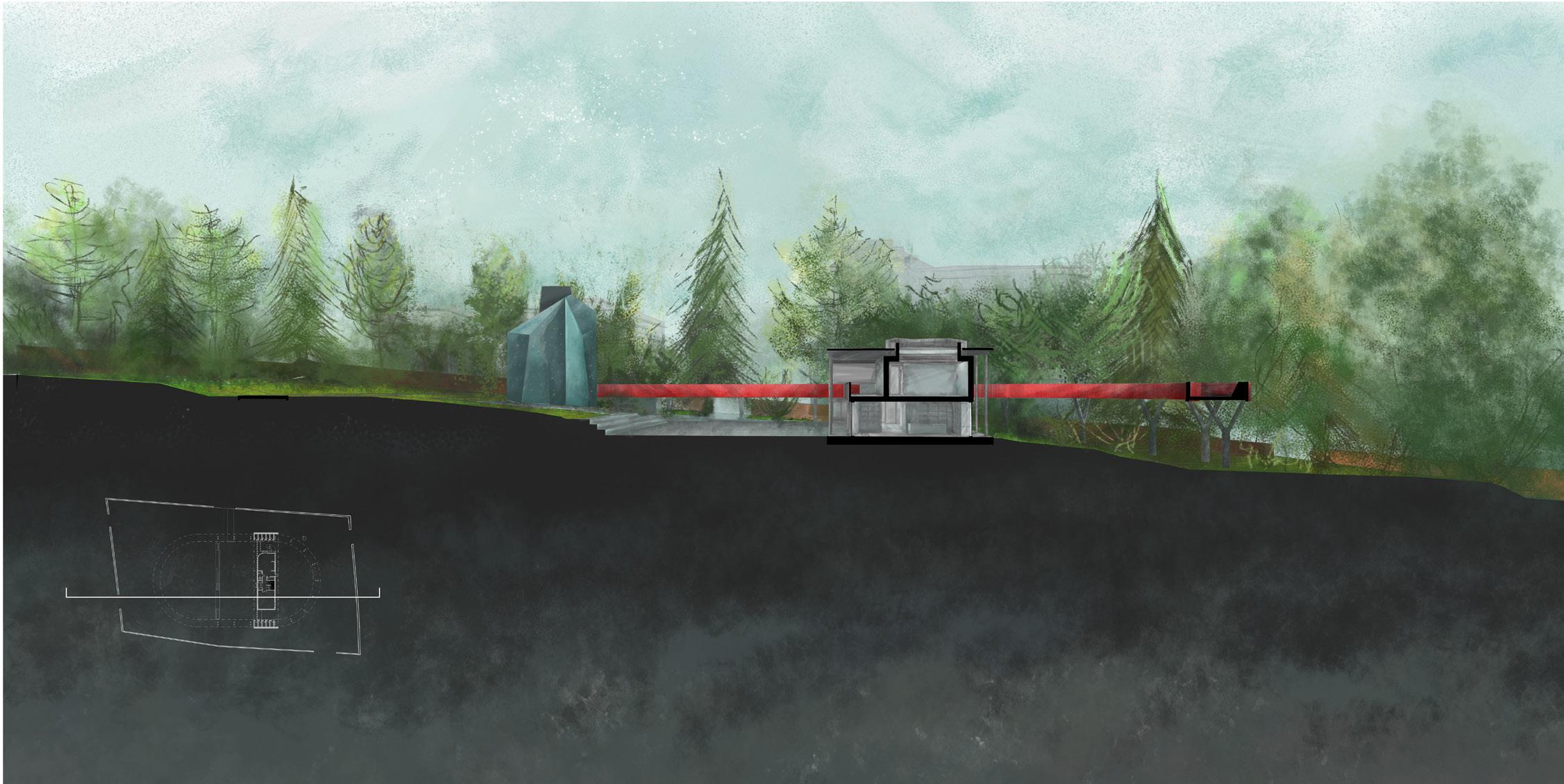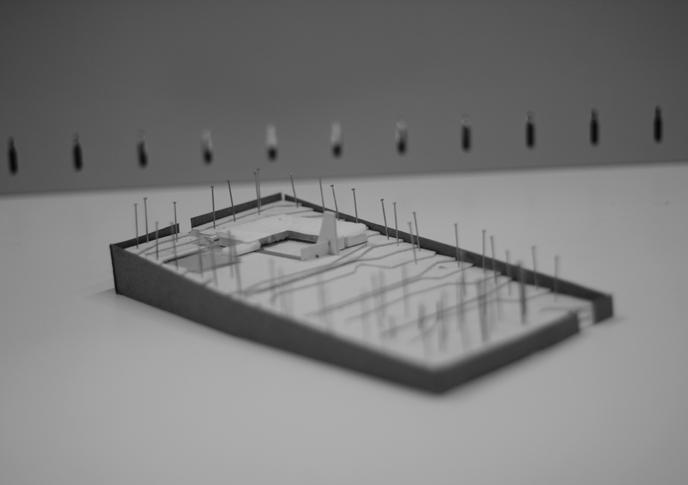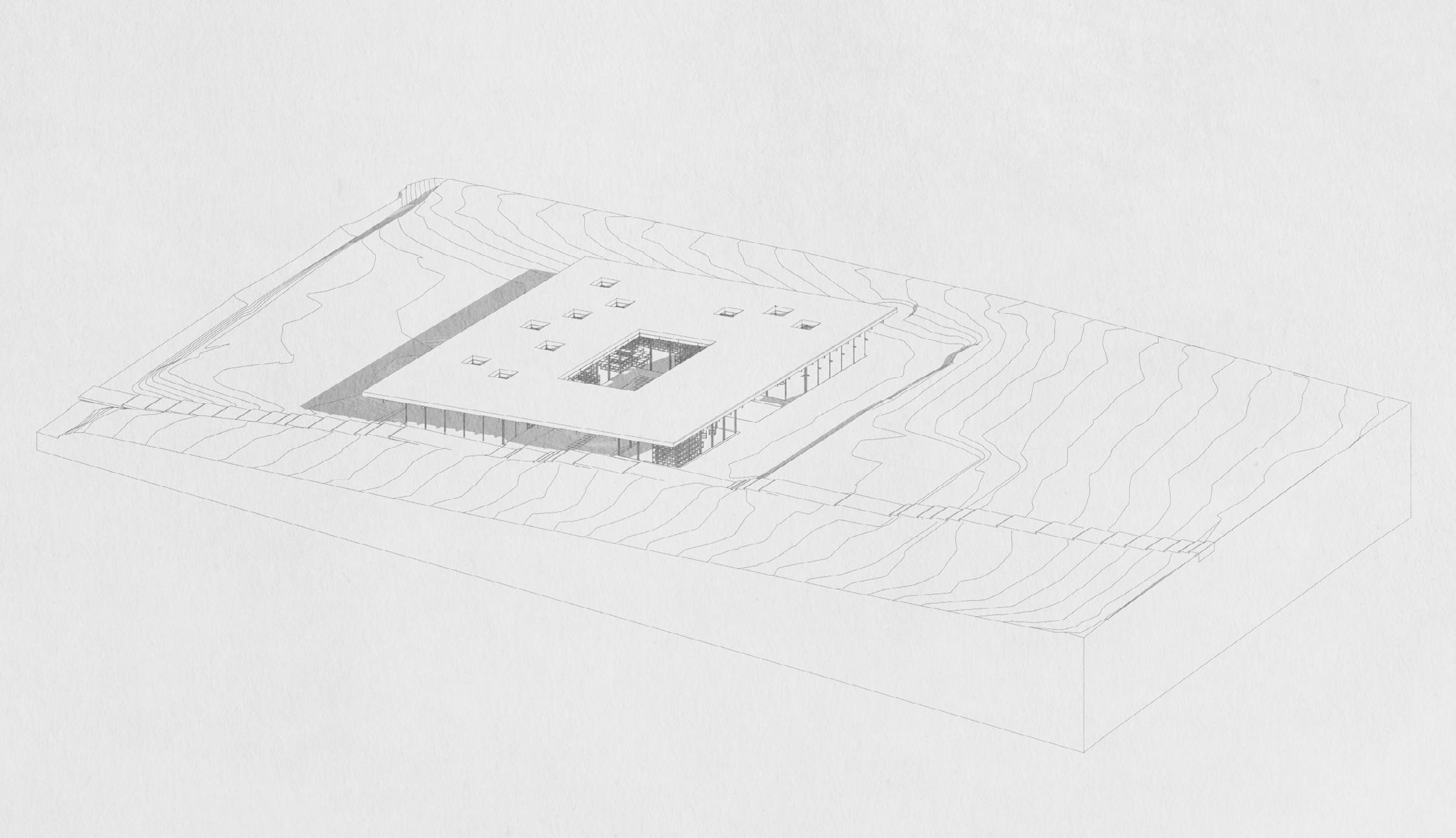 A műemlék megtartása és a tervezésbe való bevonása volt az egyik fő célom. Annak méreteiből és arányrendszeréből kialakítottam egy raszterrendszert, amihez igazodva állapítottam meg az építési területet, az épület arányait és szerkezei kiosztását. Az épület telepítését ezért a műemlék mögé helyeztem el, a hozzá tartozó építési területet vele azonos szintre süllyesztettem. Ezt a területet támfalakkal kerítettem körbe, amivel épületek határfalai nem érintkeznek, a kijelölt területen szabadon állnak. Az épületek a műemlékkel egy privátabb belső teret jelölnek mi, ahova szabadom kitudnak szerveződni a benti programok, és dinamikus kapcsolatban áll a külső fedett-nyitott terekkel.