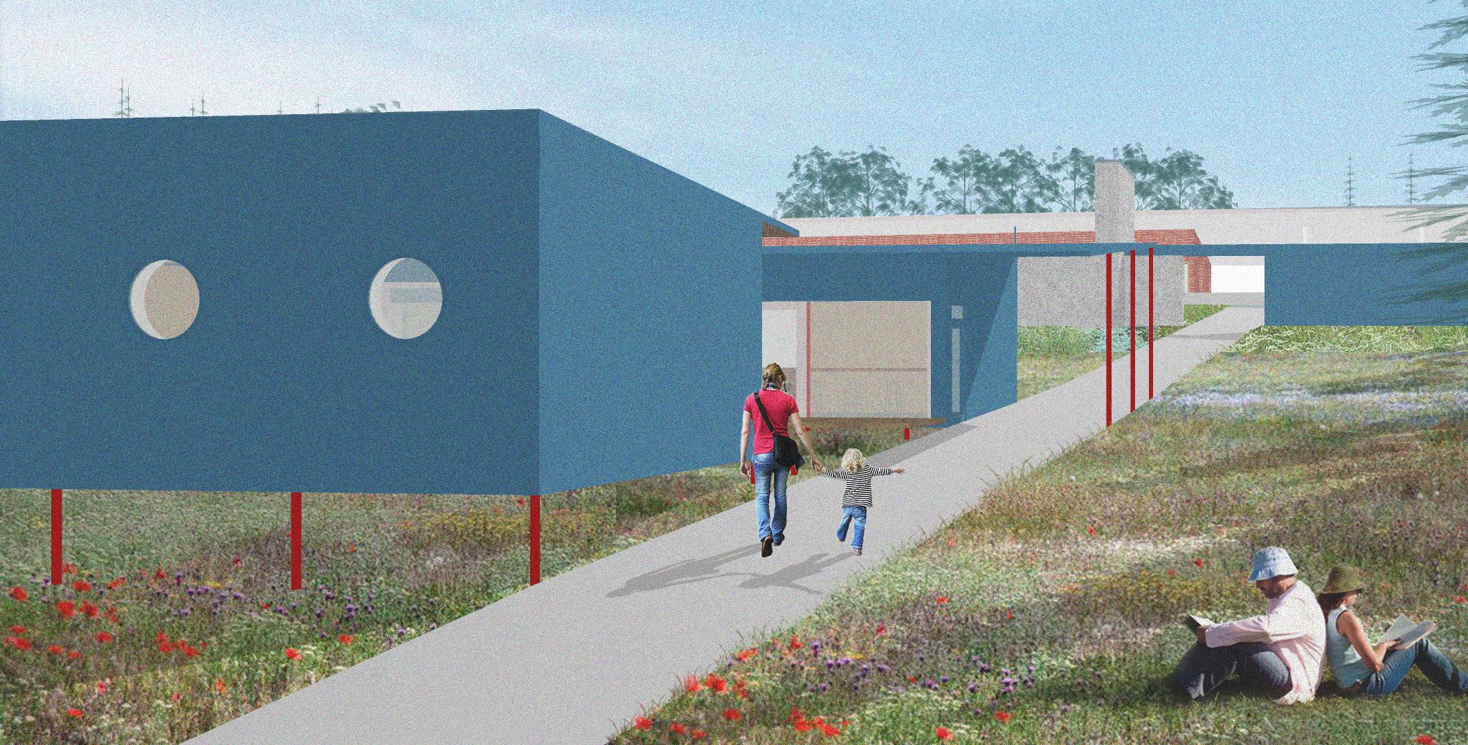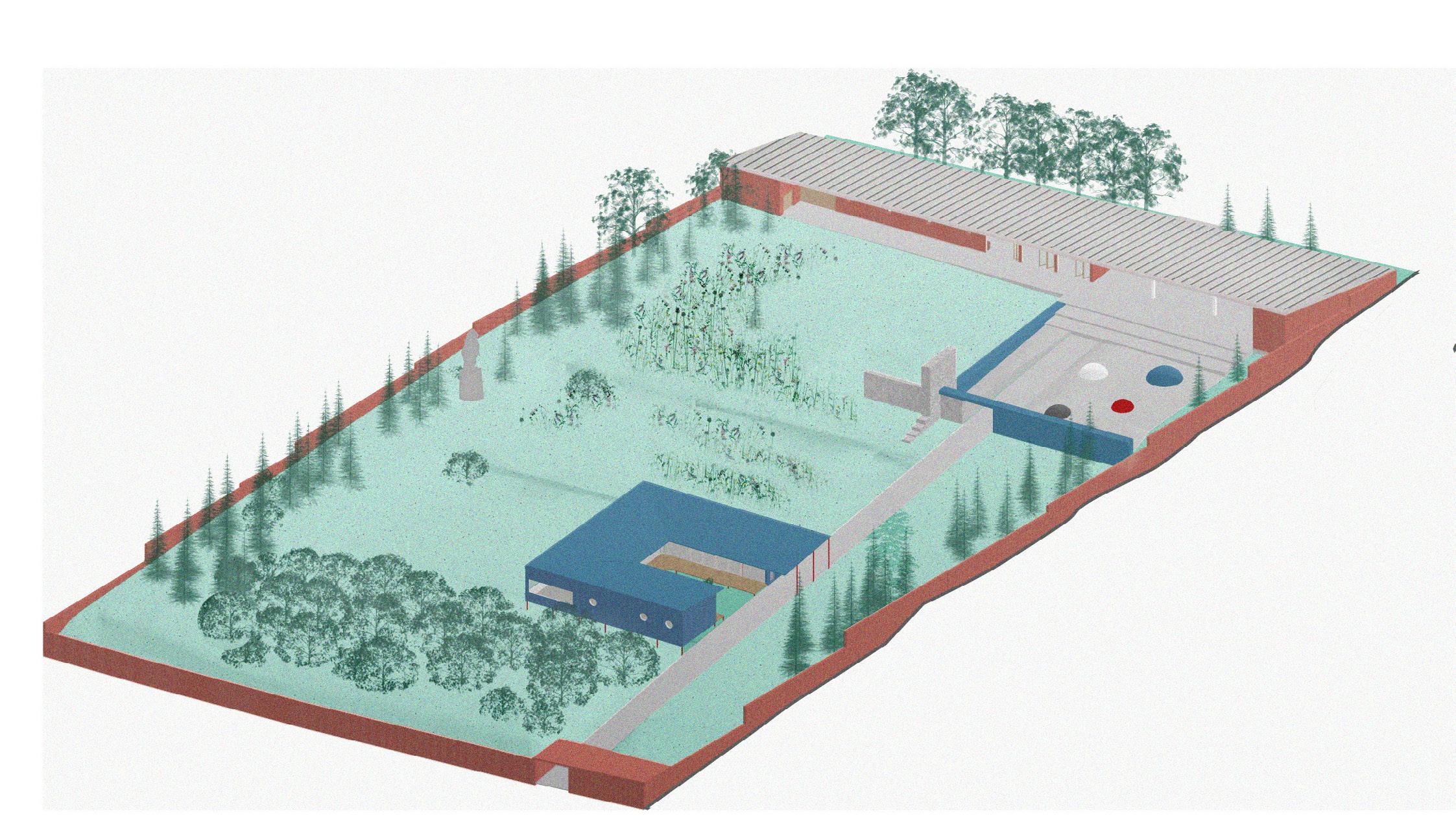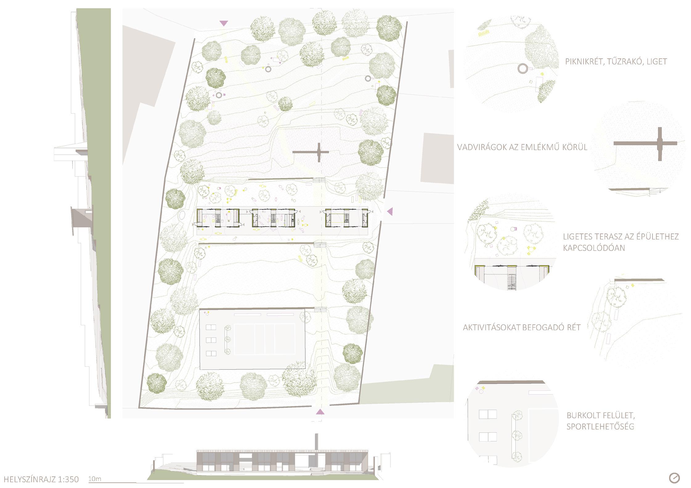 Posta Rebeka az emlékműhöz vezető út meghosszabbításával egy új tengelyt alkotott, amely által lehetővé válik az átjárás a területen. Erre a tengelyre fűződnek fel a különböző léptékű építészeti beavatkozások által létrejövő terek, melyek erős identitással töltik fel a helyszínt. A nagyrészt különböző növénybeültetésekkel kitöltött, színes játszótéri elemekkel kiegészített park közepén egy befele forduló könyvtárpavilon, a végében a téglafal felvastagodásaként létrejövő kantinépület keretezi a telket. A színes anyaghasználat mindegyik beavatkozás során megjelenik, így egységesítve a különböző tömegekből felépülő kompozíciót