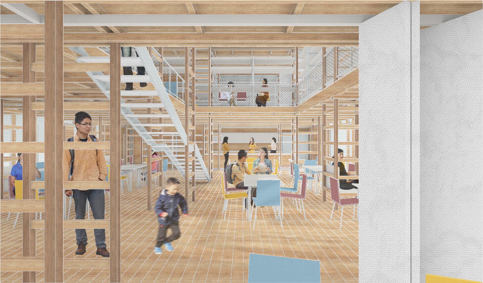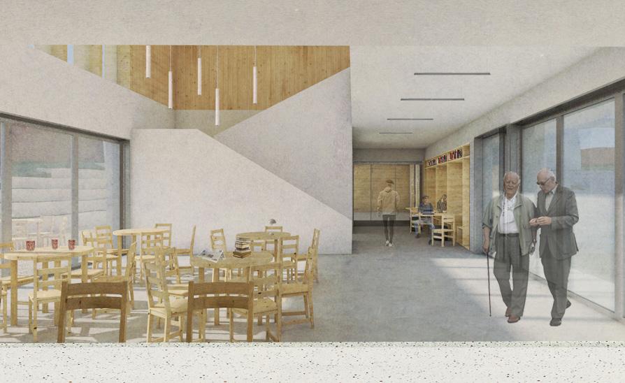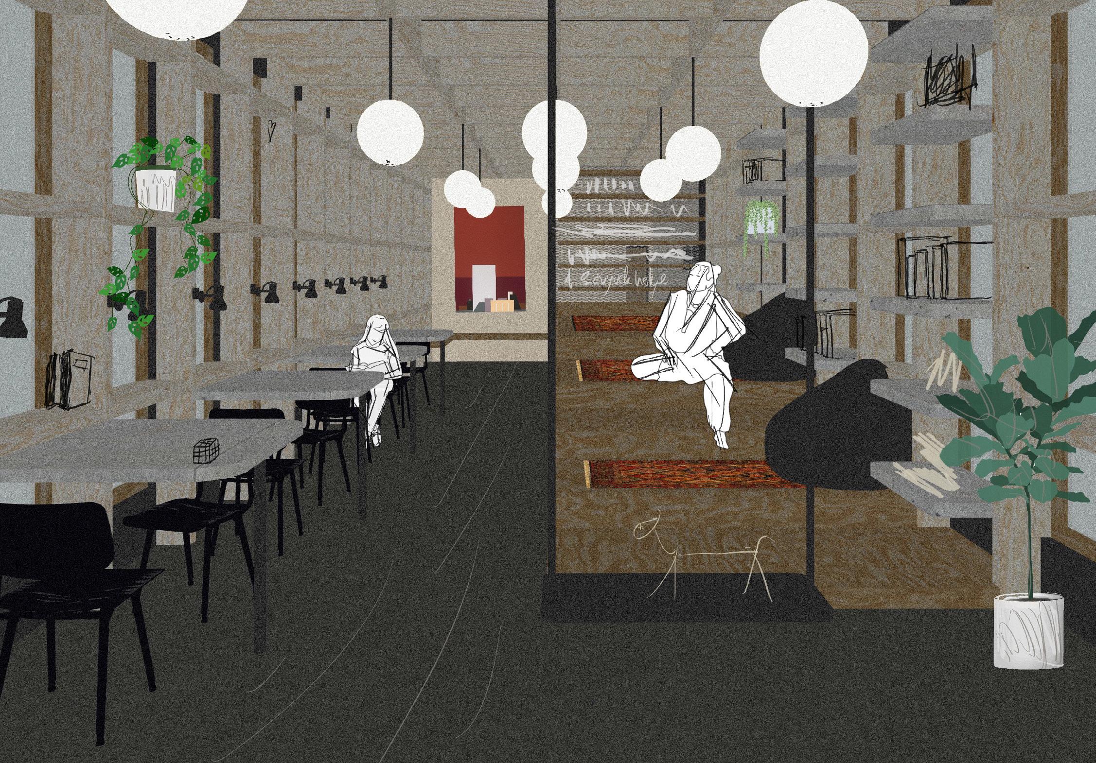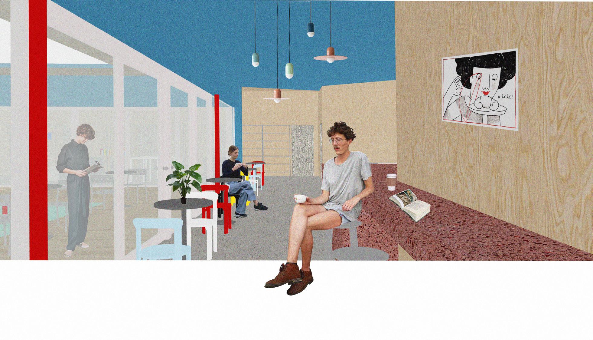 A másik célcsoport a helyi atalok, illetve a kollégisták. Ennél a csoportnál nem csak a szórakozás, vagy a sport helyszínét igyekeztem biztosítani. A tanulást elősegítő elvonuló boxokat terveztem, amelyekben akar a magánórákat, korrepetálásokat is tarthatnak. Fontos aspektusa ennek a helyiségnek, hogy ingyenes – és bár a kávézó adott, az épületben tartózkodásnak nem feltétele a fogyasztás.