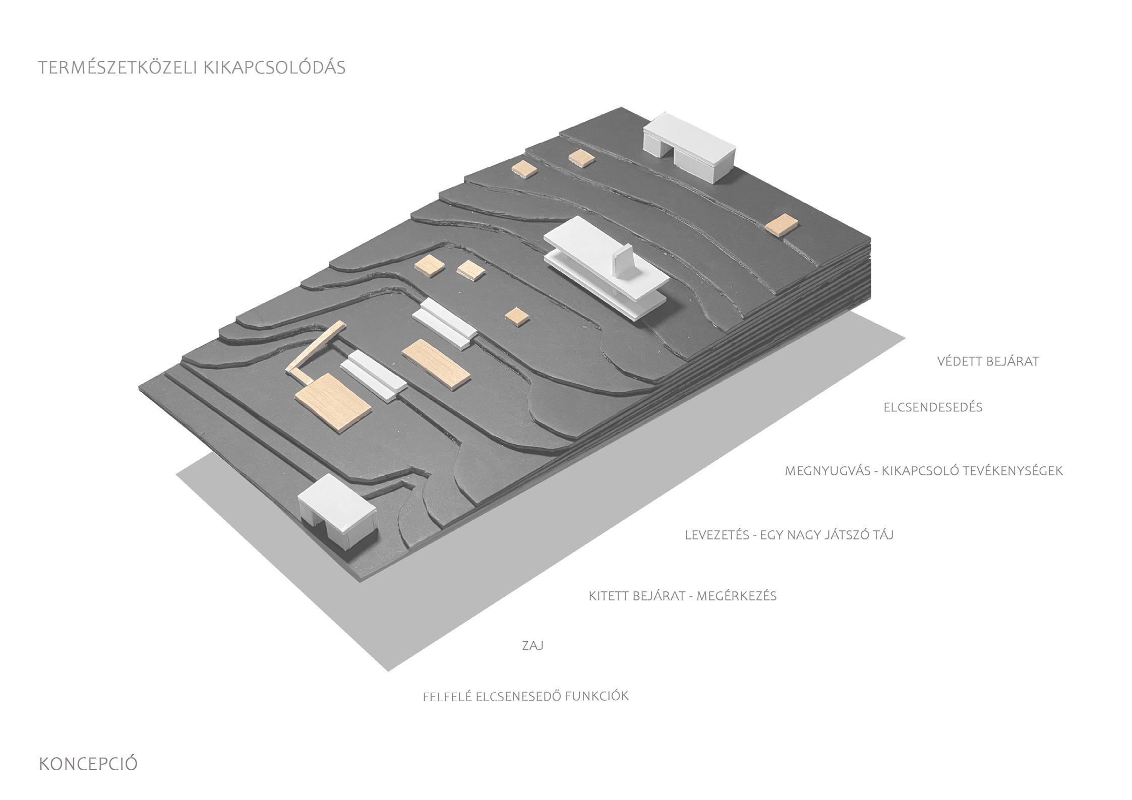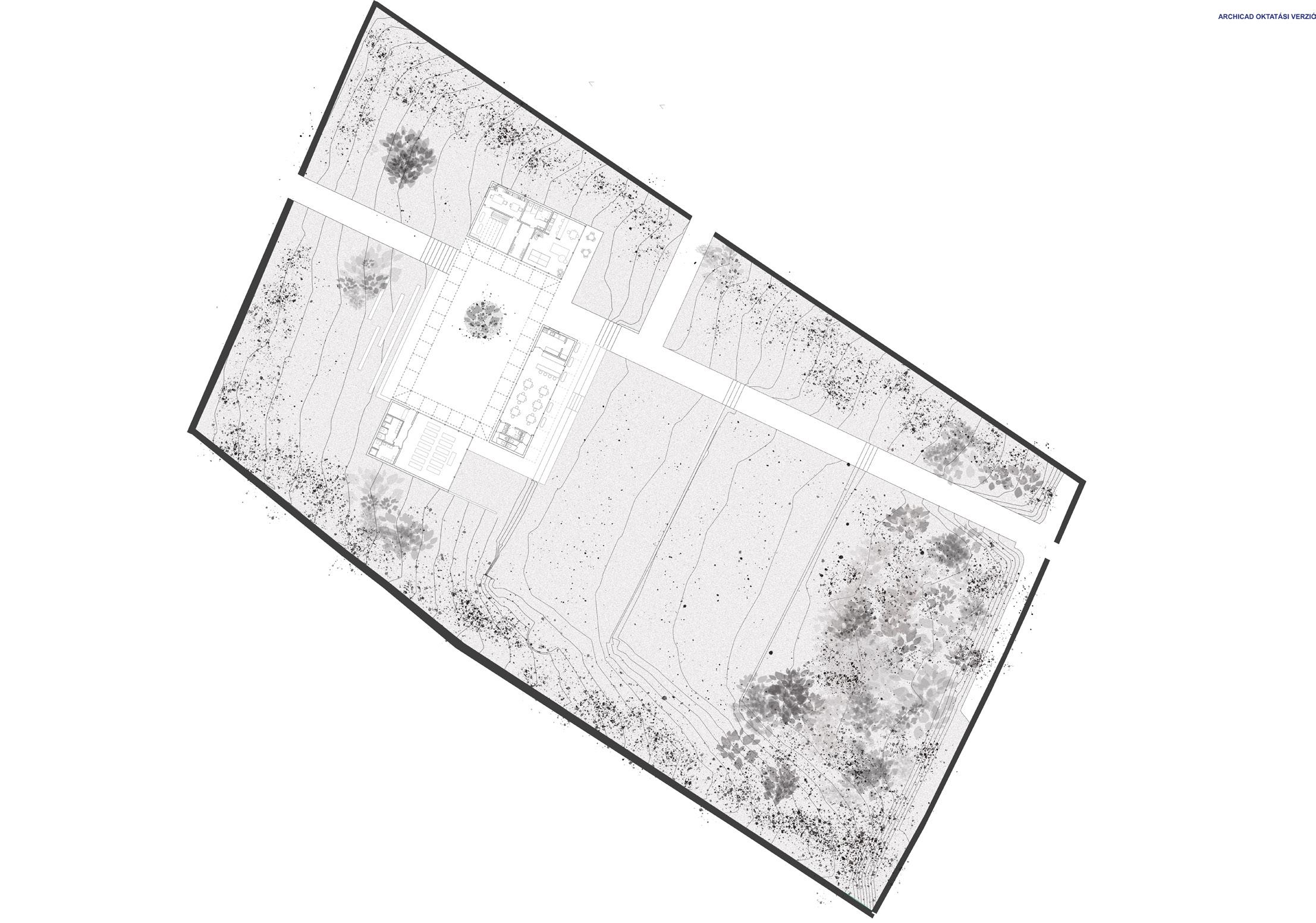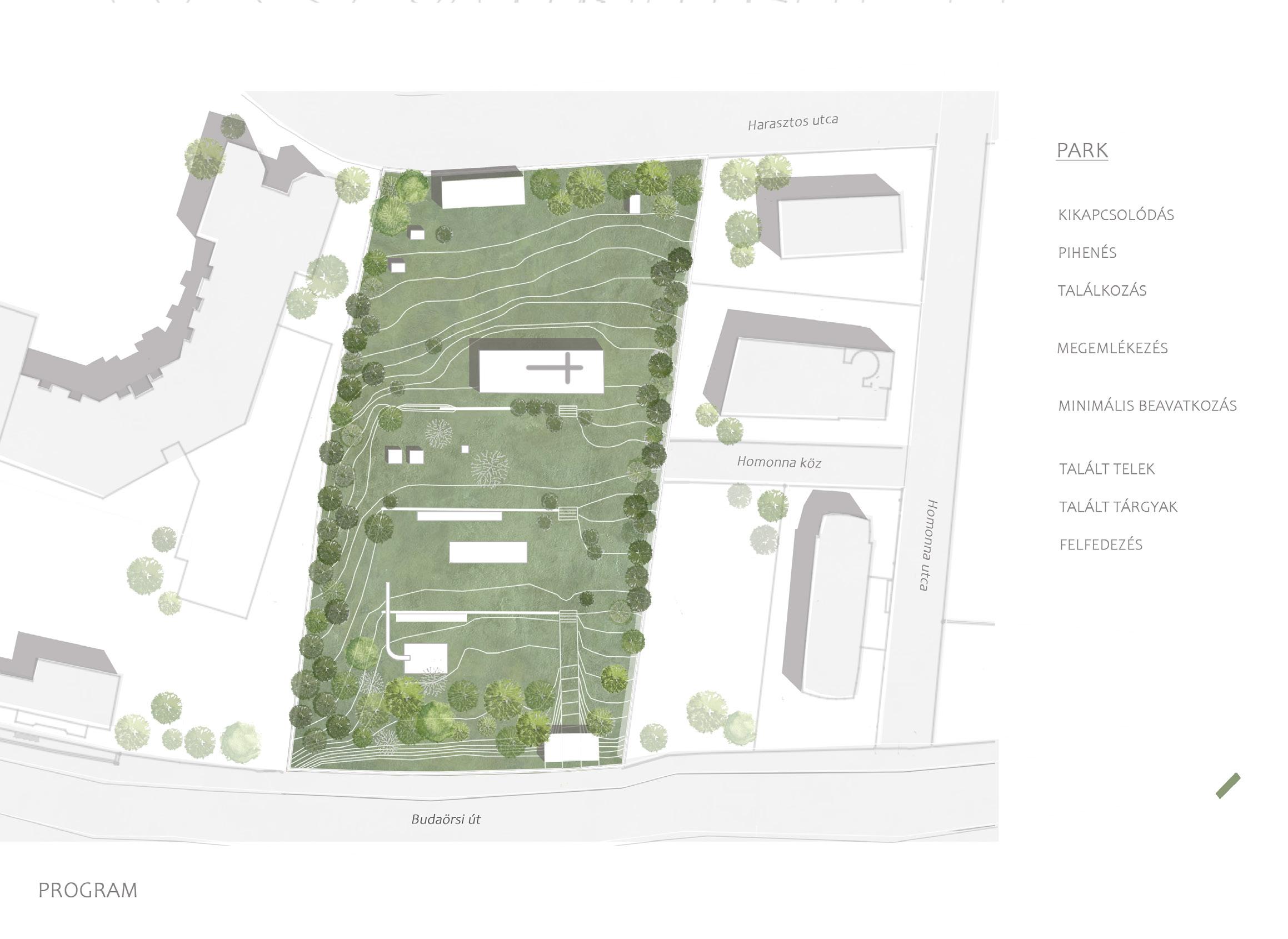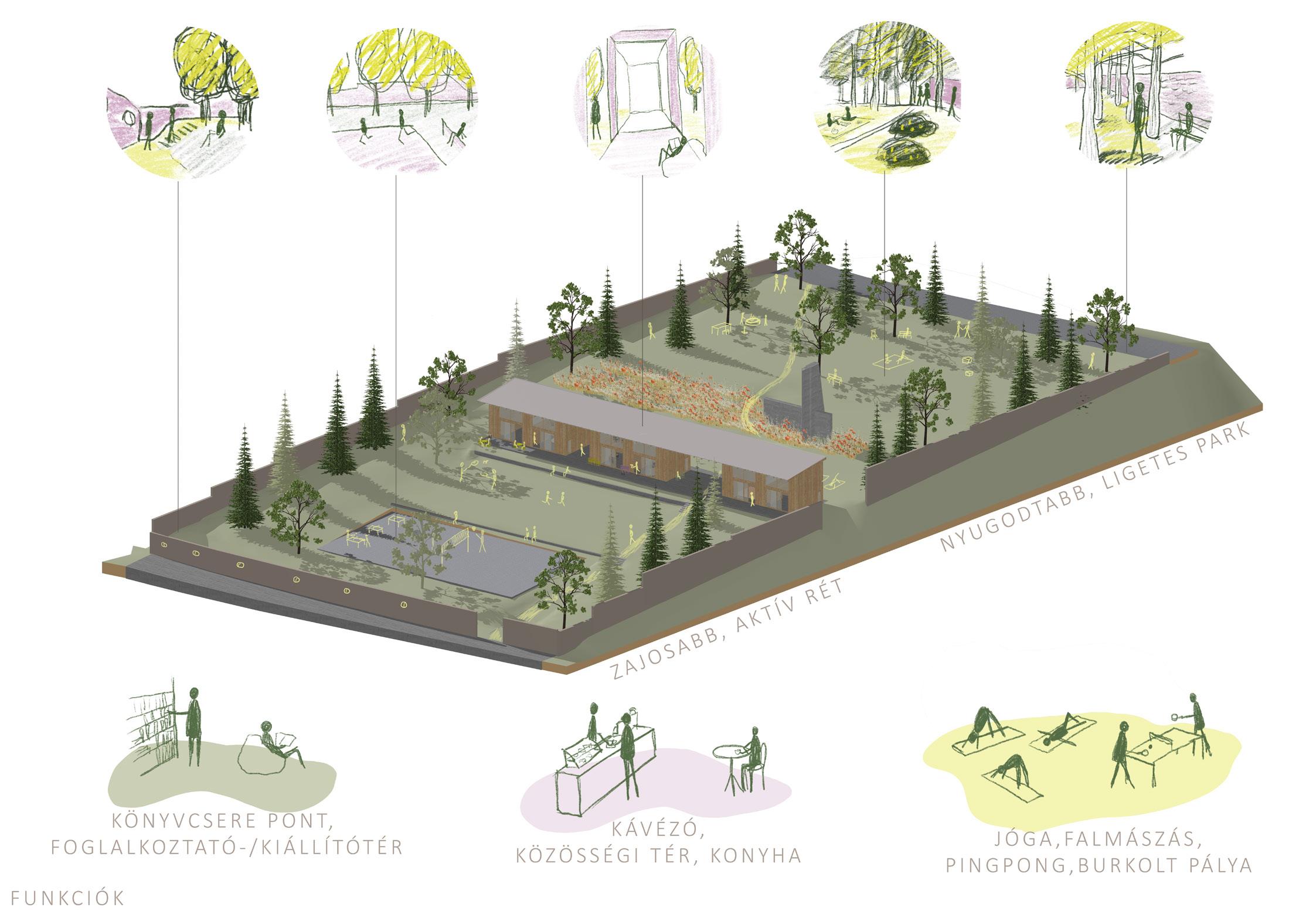 A saját tervemben a meglévő teraszokat kihasználva, különböző aktivitásokat befogadó sávokra osztottam a telket, melyet egy középső útvonallal tettem átjárhatóvá. A táj különböző módú formálása mellett kisléptékű építészeti beavatkozást terveztem, a teraszos kialakítással párhuzamos, közösségi funkciókat befogadó lineáris pavilont, mely x bútorokként funkcionáló harántfalak és a köztük kialakuló exibilis terek sorolásából épül fel. Az épület a telket két részre osztja: egy intenzívebb használatú, sportlehetőségeket nyújtó térre, és egy csendesebb, ligetes parkra. Az épület fedett-nyitott tereivel, feltárható belső világával, egységet teremtve köti össze a két oldalán kialakuló kertrészeket.