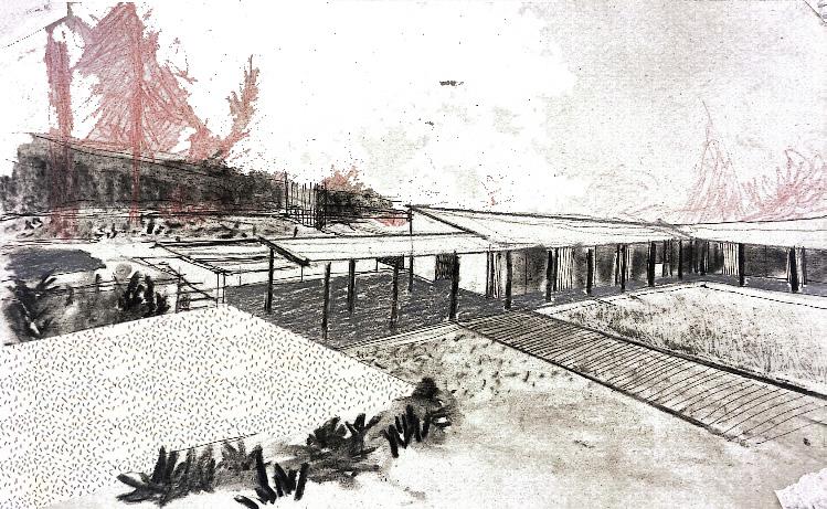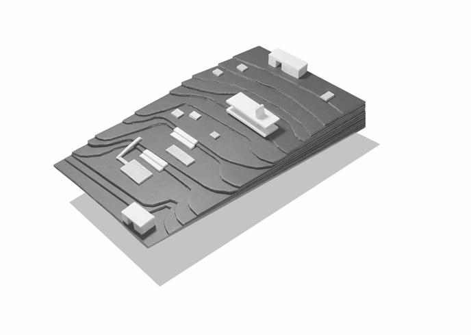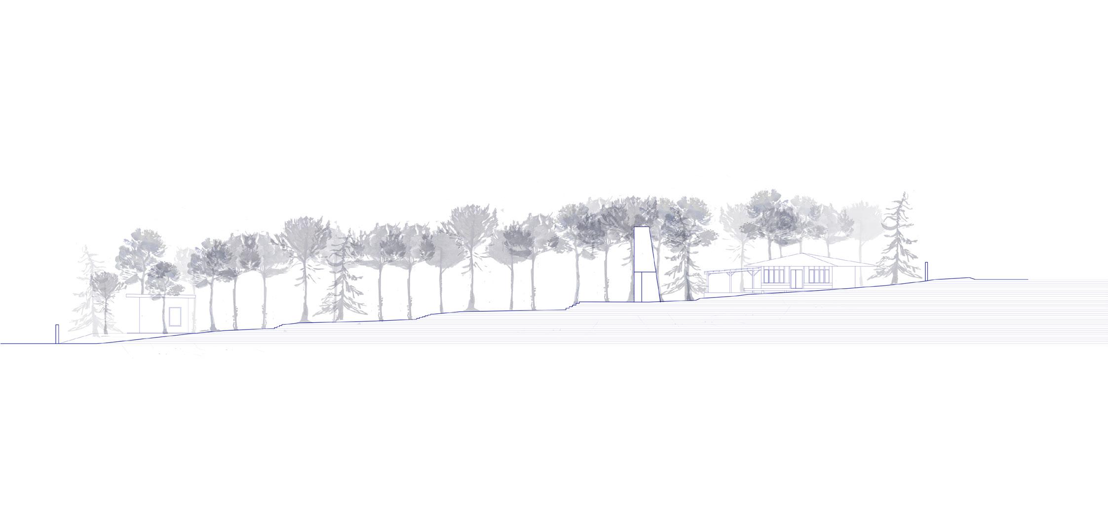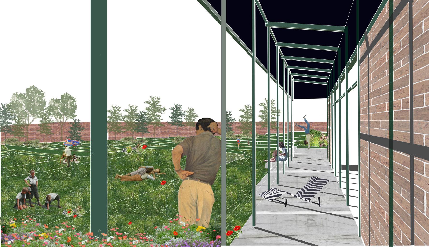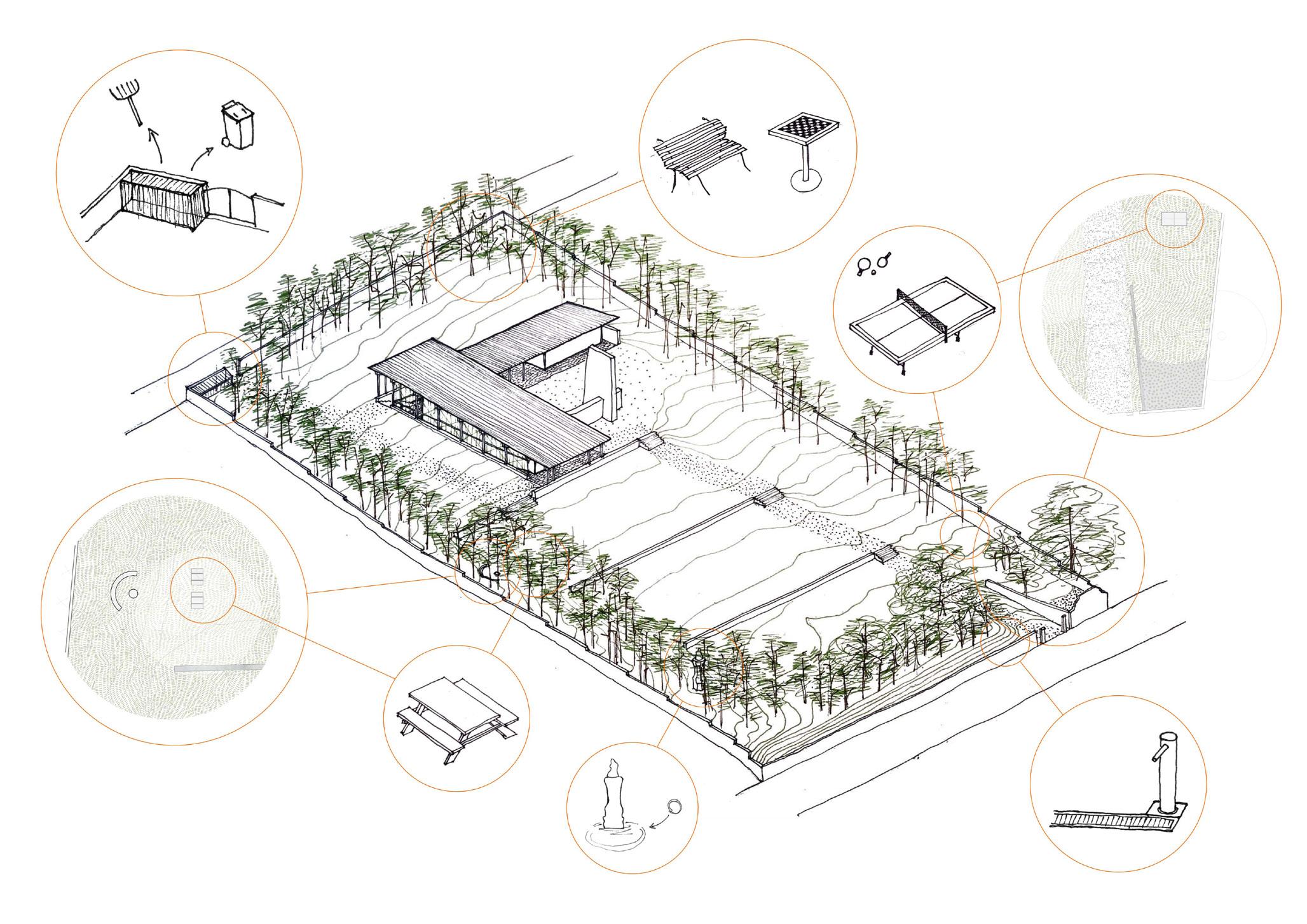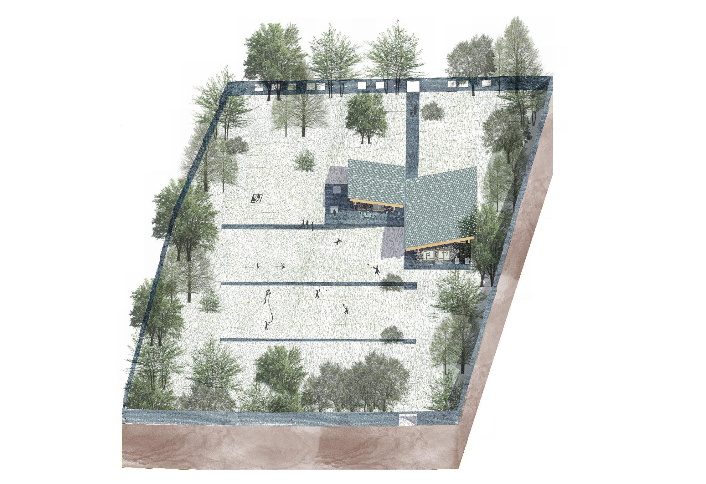 A saját tervemben a meglévő teraszokat kihasználva, különböző aktivitásokat befogadó sávokra osztottam a telket, melyet egy középső útvonallal tettem átjárhatóvá. A táj különböző módú formálása mellett kisléptékű építészeti beavatkozást terveztem, a teraszos kialakítással párhuzamos, közösségi funkciókat befogadó lineáris pavilont, mely x bútorokként funkcionáló harántfalak és a köztük kialakuló exibilis terek sorolásából épül fel. Az épület a telket két részre osztja: egy intenzívebb használatú, sportlehetőségeket nyújtó térre, és egy csendesebb, ligetes parkra. Az épület fedett-nyitott tereivel, feltárható belső világával, egységet teremtve köti össze a két oldalán kialakuló kertrészeket.