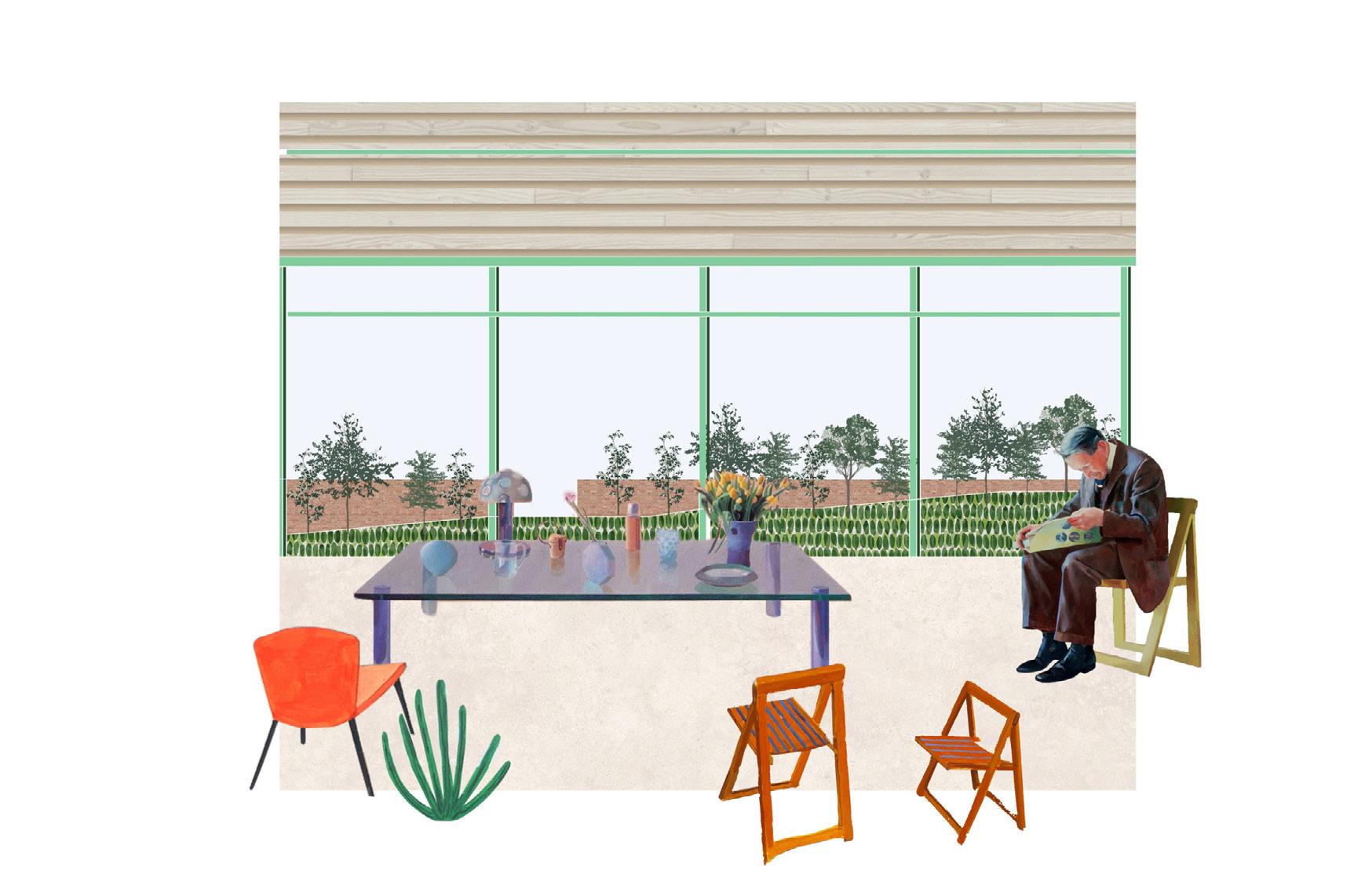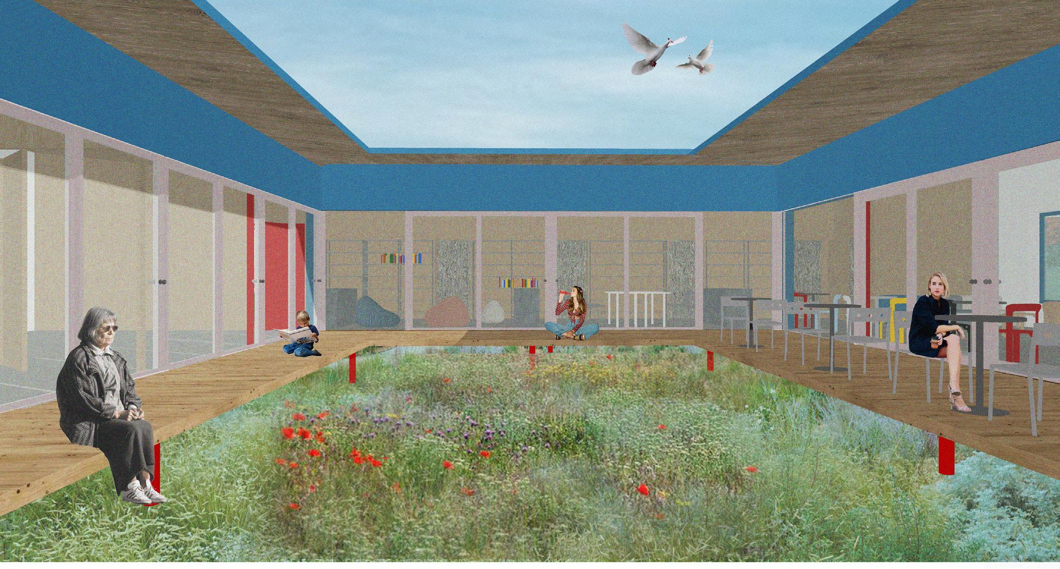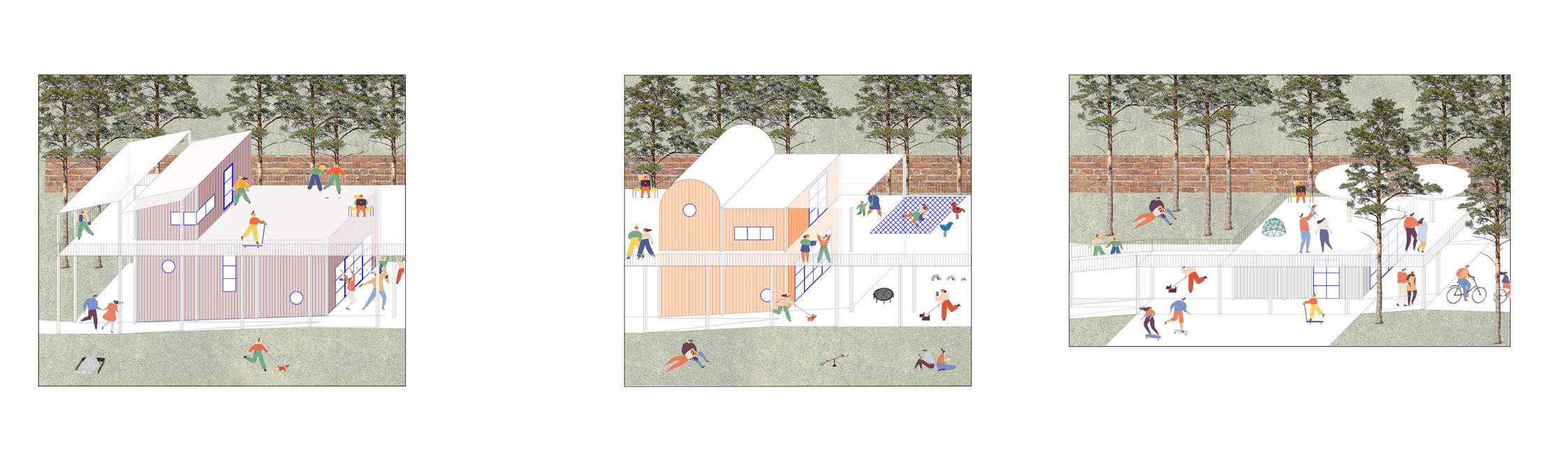 Nagyobb beavatkozások is születtek, melyekben sokkal inkább egy új rendszer, belső világ bontakozott ki, mely a jelenlegi helyzetet felülírja. Balogh Enikő a családi házak közösségi tereiből inspirálódva tervezte meg a közhasználatú nappalit és kávézót magába foglaló pavilonpárost, melyet egy szétterülő terasz, és az épülettömegekre helyezett pillangótető fog össze. A pavilon kedvességét a nyitott, lépcsőzetes elrendezés, illetve bútorként is funkcionáló galéria, és a téglakerítés nyílásaira hajazó kerek megnyitások erősítik. A park többi része fákkal és bokrokkal tarkított szabadon használható térként fogalmazódik meg.