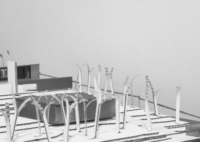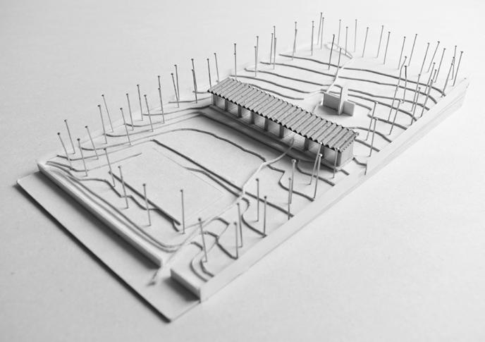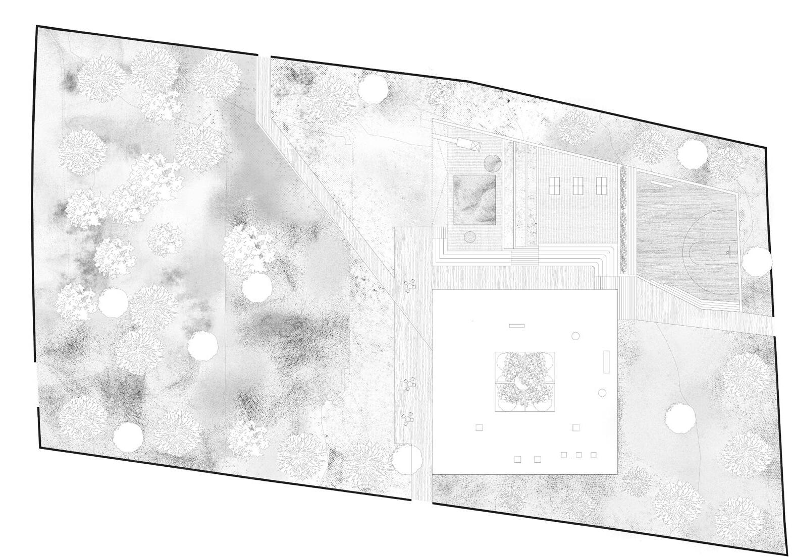 Az épület tartószerkezete az alapvető funkcióján túl különböző minőségű játszótereket jelöl ki, például hinta, mászóka. Fontosnak tartottam a terület jelenlegi állapotának megtartását, így az útvonalak kijelölésére szórt kavics járófelületet terveztem, amelyhez közvilágítás is tartozik.