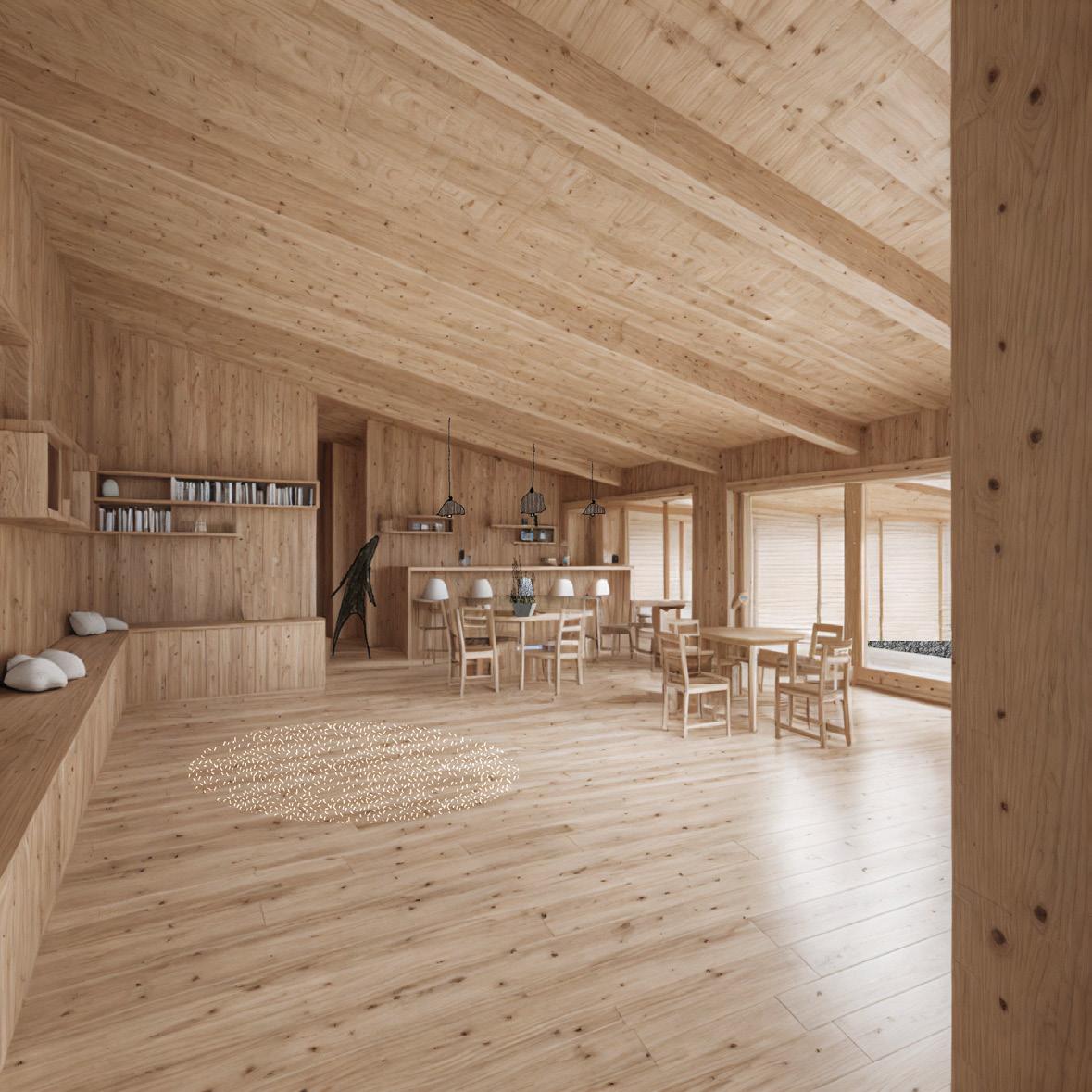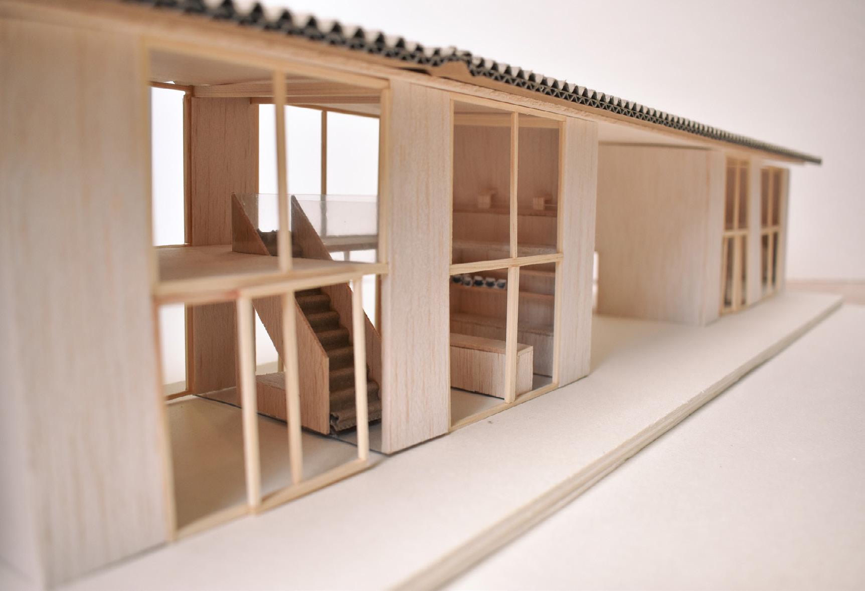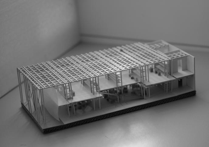 Az épületek oszlop-gerendavázas szerkezetet kaptak, amik kapcsolatban állnak a külső fedett-nyitott terek szerkezetével. Vizuálisan egy olyan hatást szerettem volna elérni, ahol a tető az épülettől elemelkedik, ezért a tetőfedés a zárófödém fölé emlkedik. A tetőt külön szerkezeti rendszer hordja át, de a pillérei azonosak az épületével.