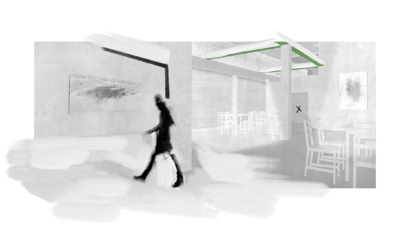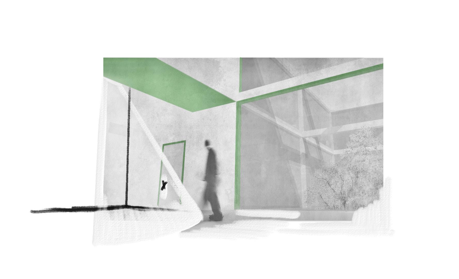 A telket körülvevő falak és fák, illetve a szépen gondozott park zöld felülete egy zöld oázishoz hasonlítható területté emeli a zárványt. Ezt a titokzatosságot, illetve védettséget szeretném koncepciómmal kiemelni és fokozni. A közösségi élet működésének helyszíneit a multifunkciós terekben és egy mindenki számára nyitott kávézóban és mediathekben képzeltem el. Az épület mindkét oldalán más minőségű zöldfelületeket és teraszokat terveztem, melyek szintén a különböző programok és események létrejöttét szolgálják.