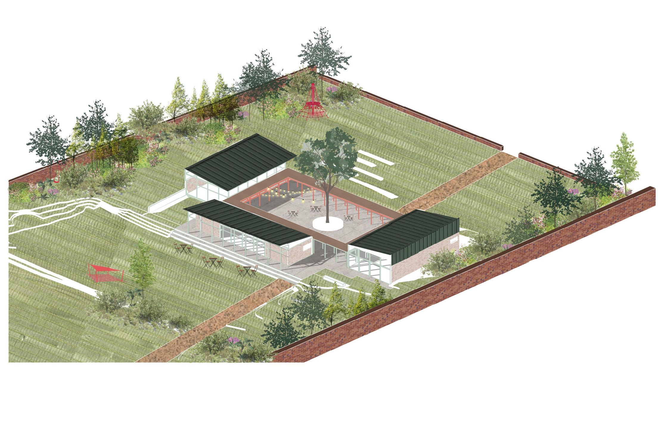 A pavilonok más-más jelleggel bírnak, így egy kávézó, sportfunkció és egy közösségi ház kapott helyet bennük.