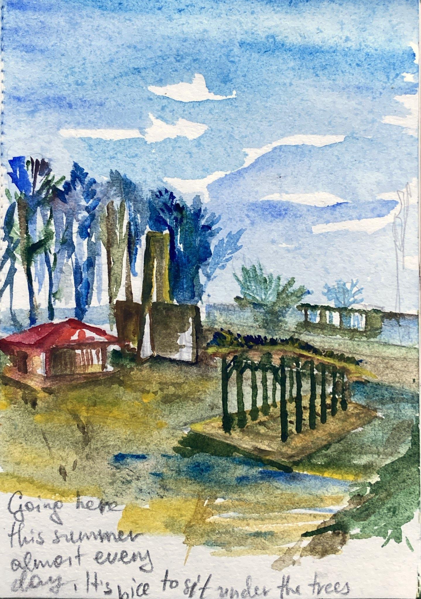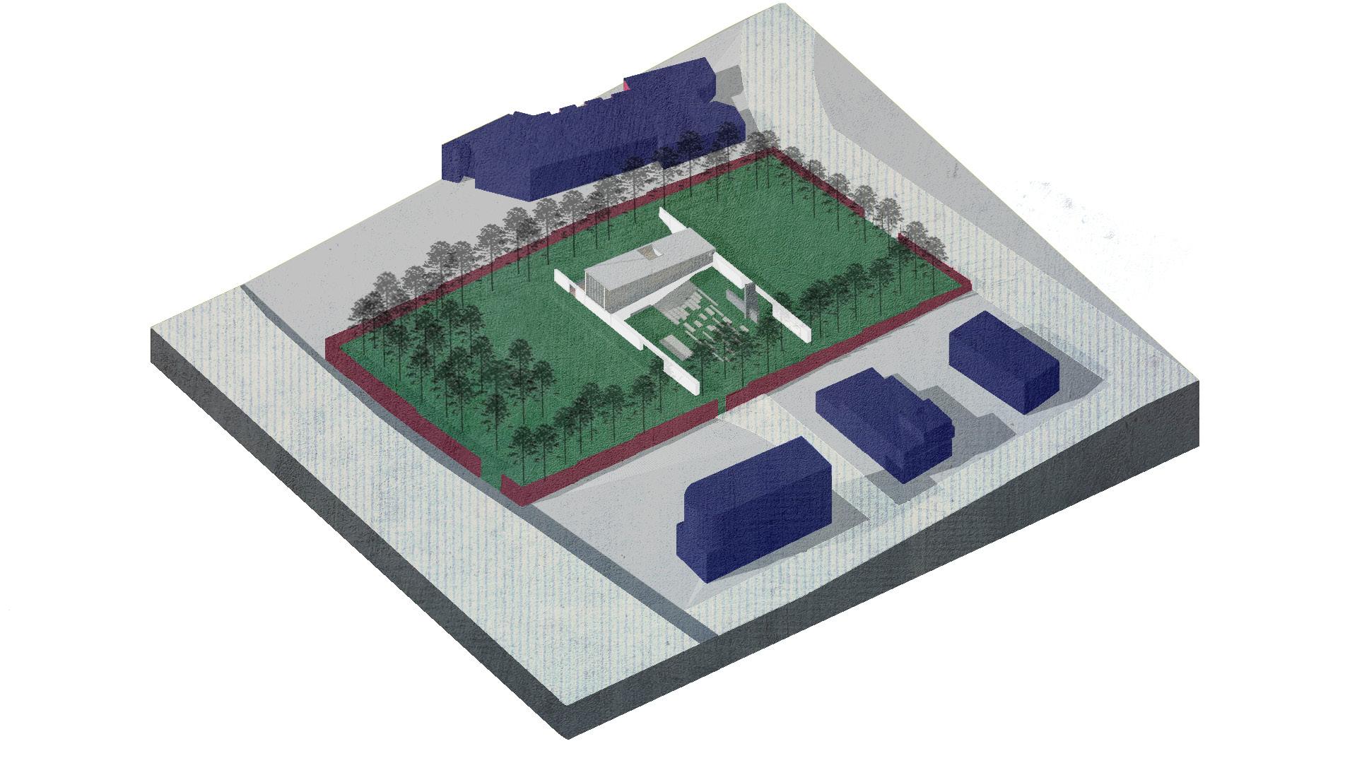 A féléves tervezési feladat egy volt amerikai katonáknak létrehozott temető és kert újragondolása, rehabilitációja volt. A telek erős, karakteres tulajdonságokkal rendelkezik előző funkciójából adódóan. Ilyen például maga az emlékmű, mely a kert tengelyében helyezkedik el. A félév kezdetén történő kutatási folyamat és a telek megismerését szolgáló vizsgálat eredményeként egy közösségi ház létrehozására tettem kísérletet a telken. A programalkotás folyamatának célja az volt, hogy olyan funkciót jelöljön ki, mely a környék lakóövezetét és az itt található irodák illetve kollégium közösségeit szolgálja, erősíti.