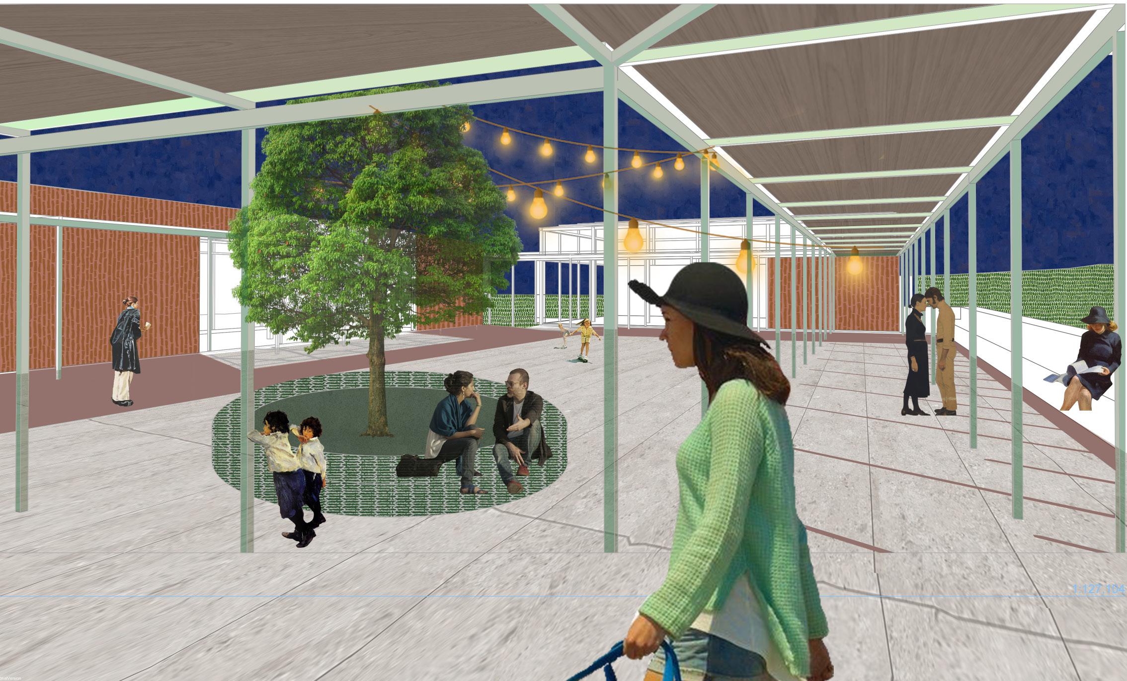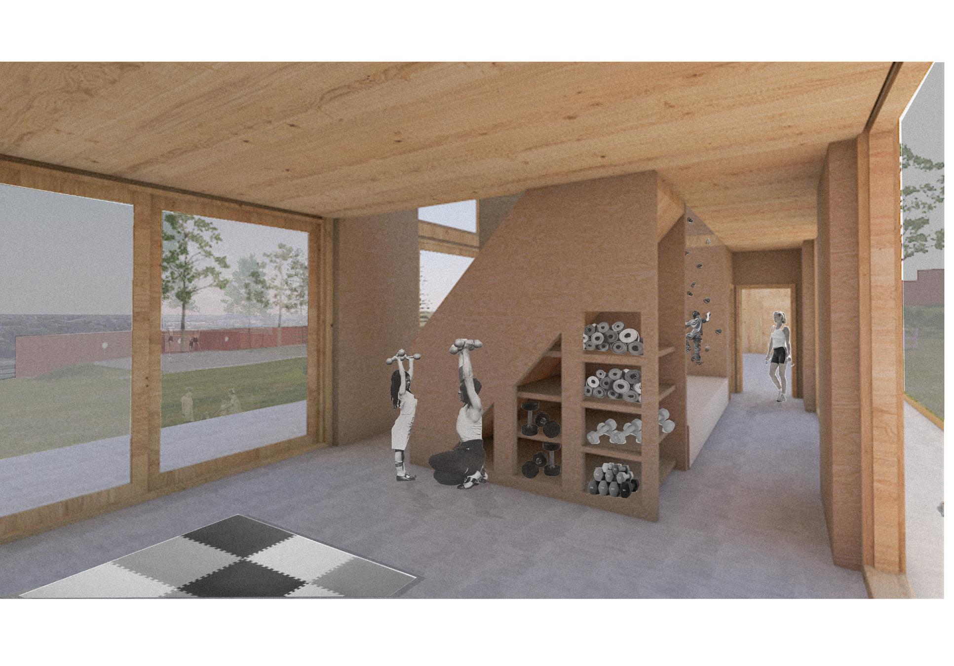 Az építményem, egy kültéri fedett közlekedésre használt acélvázas szerkezet, ami magába foglal egy keskenyebb hajót, ami a közlekedésnek ad helyet, és egy szélesebbet, ahol kis méretű CLT pavilonok (rendezvénytér, közösségi ház, kávézó-pékség, üzemeltetési helyiségek), és fedett szabadtéri sportelemek (játszótér, csúszda, mászó fal, hinták teraszok) helyezkednek el. Az építményen kívül megtalálható a területen egy nagy burkolt tér, ami az aktív sportolásnak, illetve rendezvényeknek ad helyet az itt élő közösség számára.