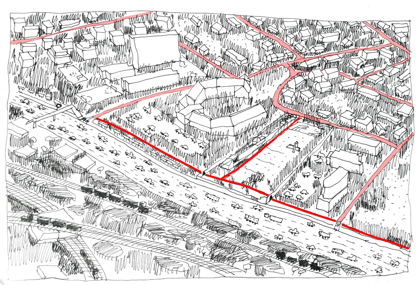 A közösségi utca projektem azonban nem csak a telekkel foglalkozik, hanem szervesen a környezetével is. Kialakítottam a helyi közösség számára egy új, a Budaörsi úttól védettebb, akadálymentes gyalogos útvonalat, illetve a meglévő járda helyére egy kerékpáros utat, a biztonságosabb közlekedés érdekében. Erről az útvonalról indul el a helyszín adottságait megtartva (teraszos kialakítás, emlékmű, téglafal, meglévő fák) és azt kiegészítve egy új közösségi utca tervem, ami összeköti a Budaörsi utat a lakónegyeddel, miközben az itt élők igényeit kiszolgáló, többfunkciós és többgenerációs – kulturális, edukációs - tereket hoz létre.