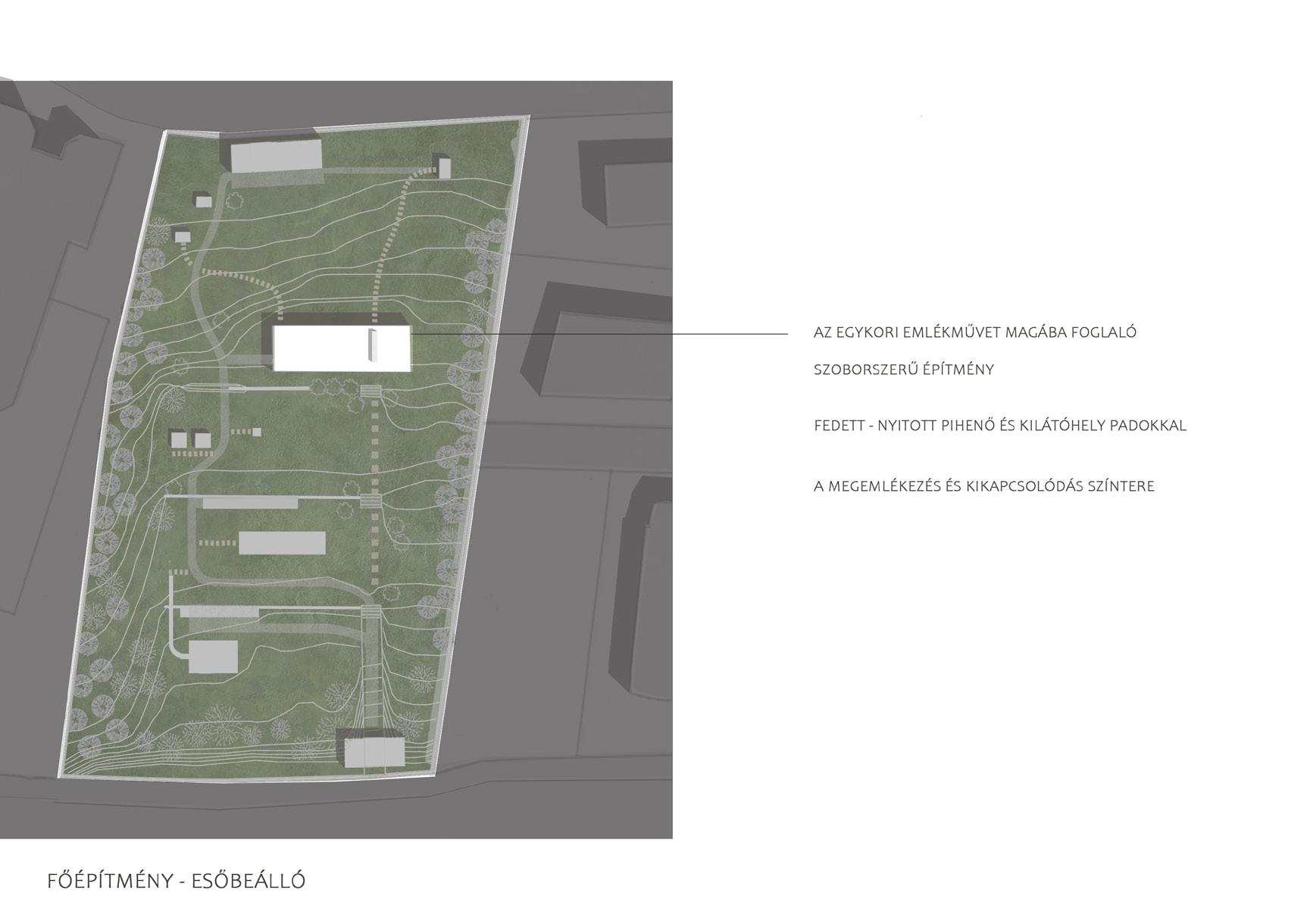 Sokan a meglévő adottságokat továbbgondolva, lehetőségeiket építészeti nyelvre formálva gondolkoztak. Lipótzy Kristóf tervében az emlékmű környezetére koncentrálva, egy újabb réteget hozott létre a helyszínen, melyet egységes építészeti arculatban képzelt el. A meglévő falakon belül kijelölt egy lehatárolt sávot, ezzel kihangsúlyozva a telek zárványhangulatát. A park többi részét szintén érintetlenül hagyva, ezt a belső világot rendezte be megfontolt kézmozdulatokkal. Az újonnan kialakult zónát építészeti beavatkozásokkal bővítette: a falakra merőleges tengelybe behúzott épülettömeg két oldalán létrejött egy csendesebb terasz és egy lépcsőzetes lelátókkal ellátott nagyobb tér az emlékmű körül. A nagyobb léptékű, többszintessége miatt mégis kompakt épületben kávézó és mediathek funkció kapott helyet.