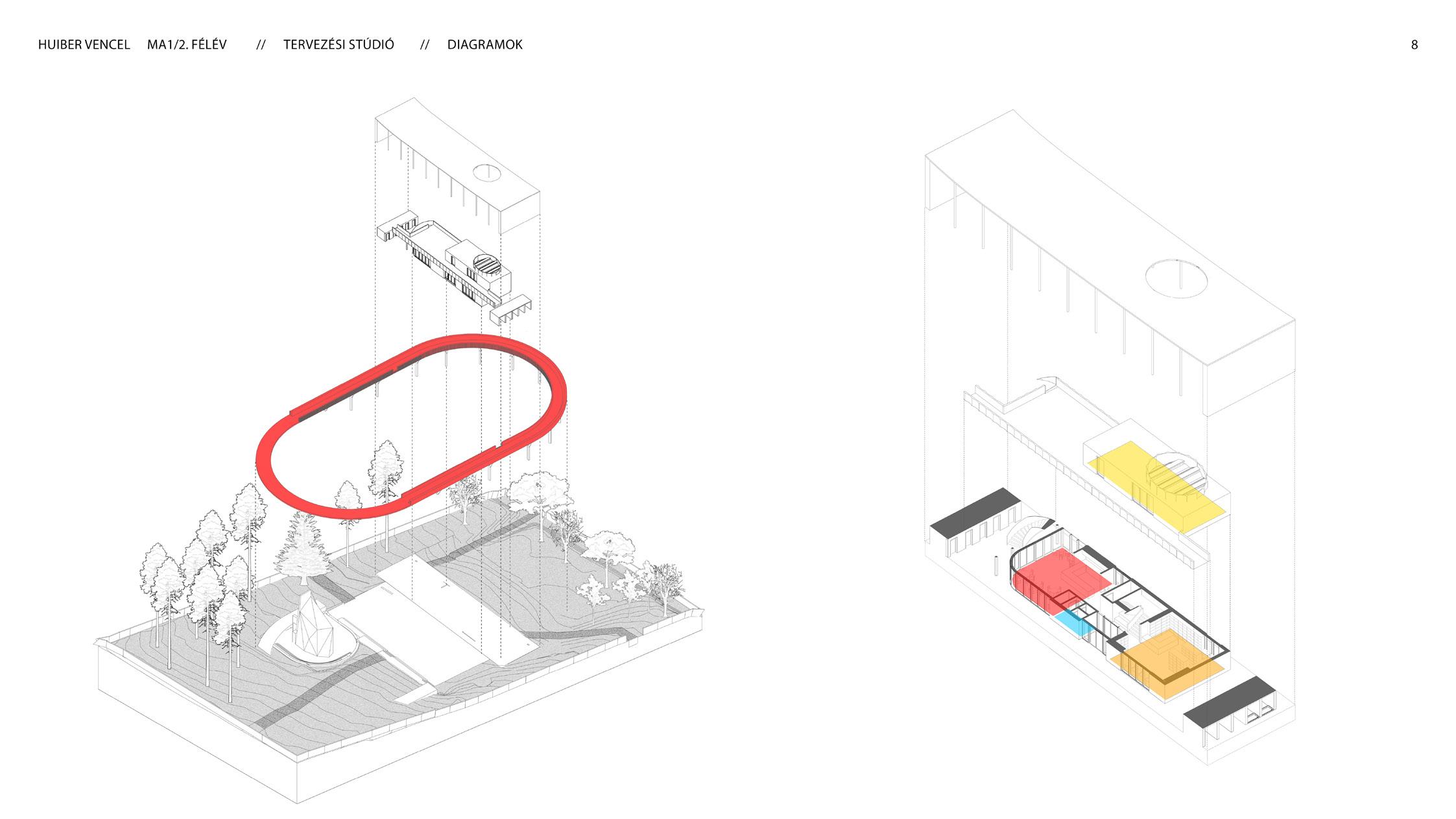 Az általam tervezett épület tervezési koncepciója két fő tényezőből adódik. Az első, a tervezést megelőző kutatásból, és városrész felméréséből következett, ami alapján a környéken részeken lakóknak egy sportolási lehetőséget nyújtó épületre lenne legnagyobb szüksége. Ez magába foglalja a környező oktatási intézmények használóit, az óvodától az egyetemig, valamint a kertvárosias részen lakók igényeit. A másik kiindulópont a telek lejtéséből adódott amely szigni kánsan meghatározza a leendő épület lehetőségeit. Ezeket összekombinálva terveztem egy futó-sétakört, amely a telek felső részének szintjét a Budaörsi út felé tolva kialakít egy vízszintes pályát amelynek közepére szabadtréi sportpályákat, mászófalat, valamint a telek mélyebben elhelyezkedő részeinél a futókör két pontja között hosszan kifeszülő kétszintes “pavilont”. Amelyben kiegészítő funkcióként található egy kávézó, olvasóterem, és a felső szinten egy (gyermekfoglalkoztató). Az így kialakuló funkciók az épületben barátságos léptékben valósulnak meg, amelyek építészeti kvalitásaik miatt nyitnak mind a céltudatos használók felé, mind az arra járó, a területet parkként használó szélesebb publikum felé.