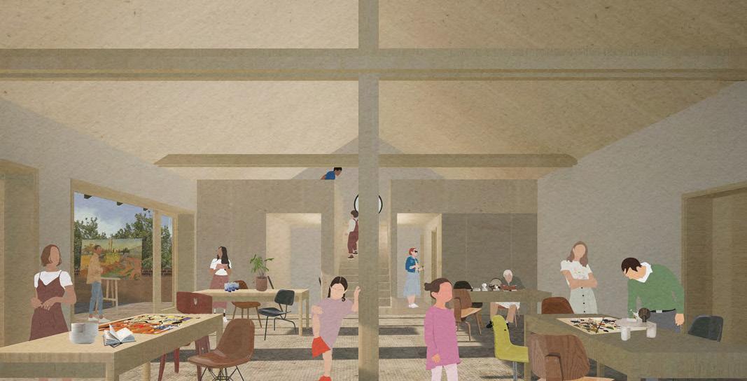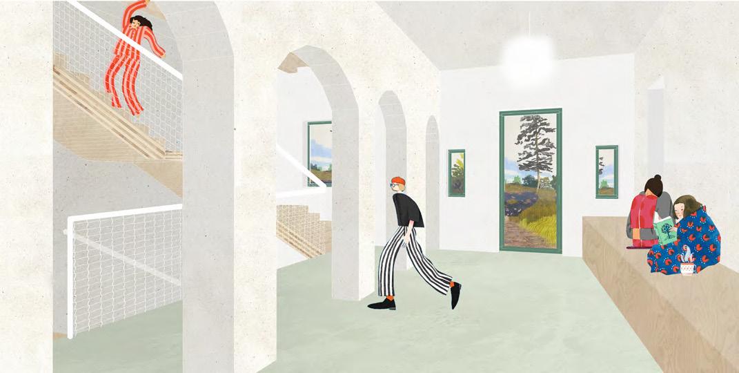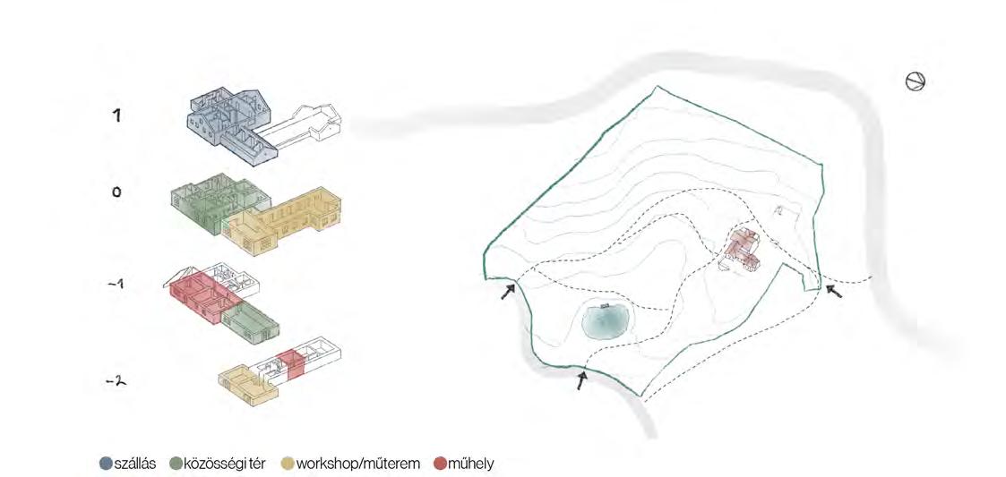 A programalkotásnál a legfontosabb szempont volt, hogy az épület, és az azt körülvevő terület önfenntartóvá és egész évben kihasználttá váljon. A négy hektáros terület kitisztítását, és karbantartását legeltetéssel, az épület üzemeltetését egy rezidencia programmal biztosítjuk, amely művészek számára nyújt lakhatást és alkotó teret. A szállást egy új tömegben alakítottuk ki, ezzel új kontextusba hozva az eredeti épületet. A meglévő épület azáltal, hogy minden szintjén kültér kapcsolattal rendelkezik, működésben alegységekre tagolódik. Az alagsori szint külön bejáratot biztosít a zarándok- és túraszállásnak. Ezektől szeparáltan működnek a gyerekeknek szóló funkciók; nyári táborok, erdei iskolák, művészeti-, természeti-, terápiás foglalkozások, együttműködve a környék iskoláival és gyermekotthonaival. A foglalkozások egy-egy külön működő, toronyszerű egységben kapnak helyet, mely mind a négy szinten átfut, különböző irányokba kiteresedik.