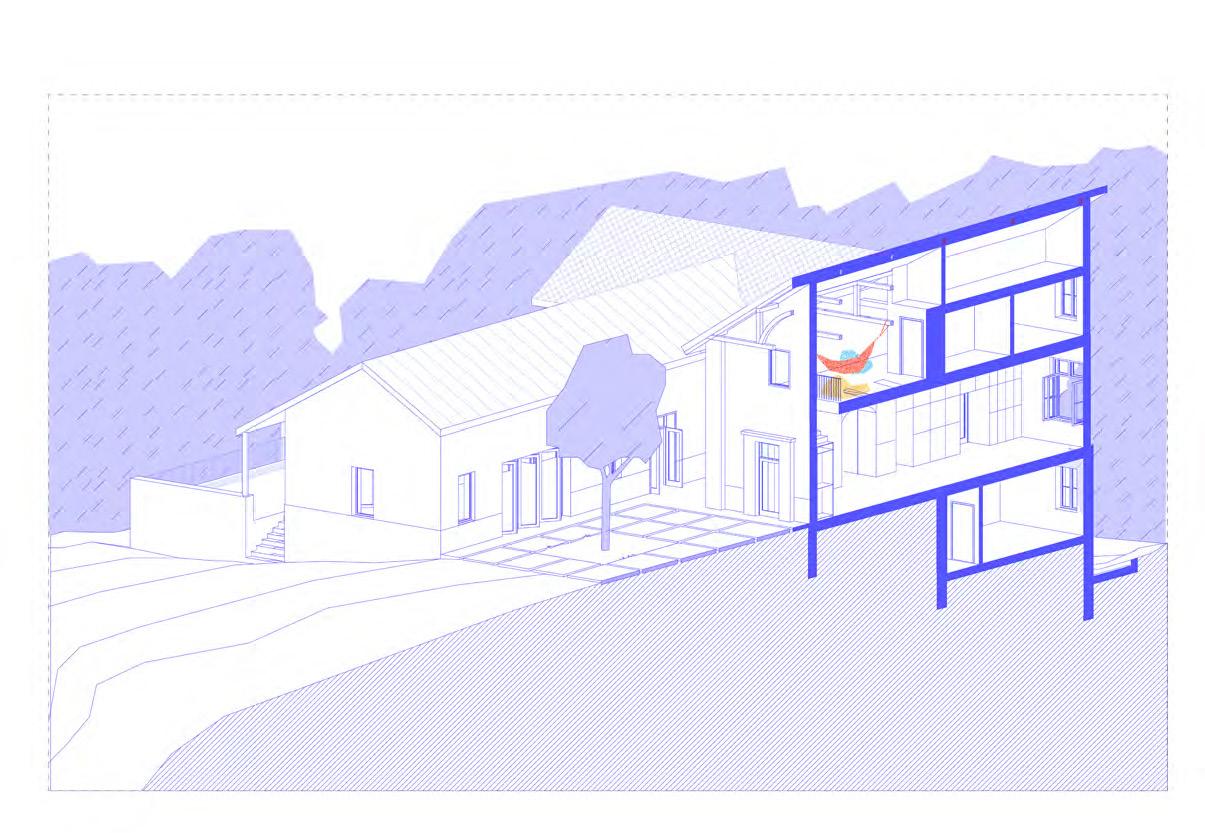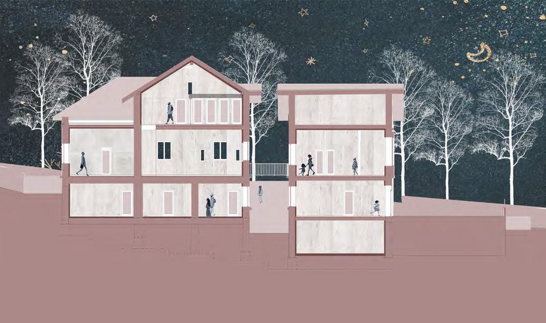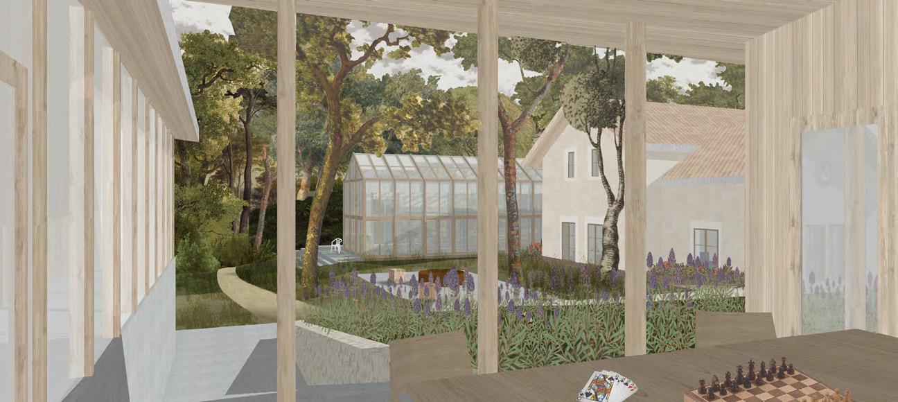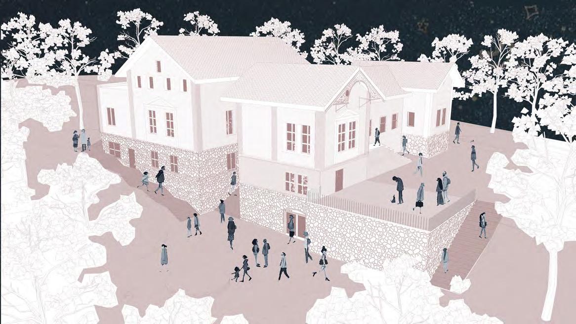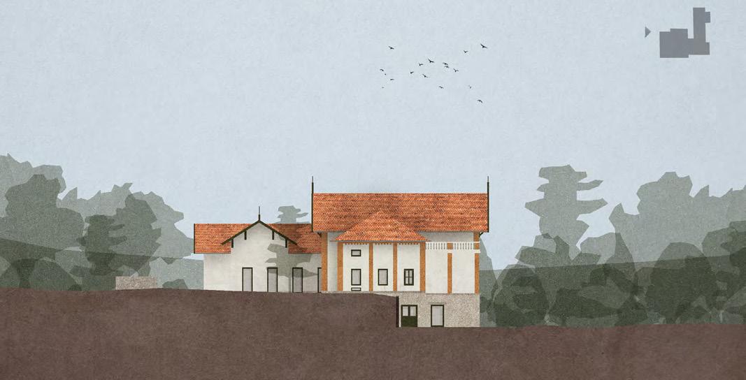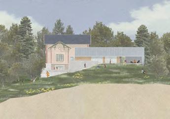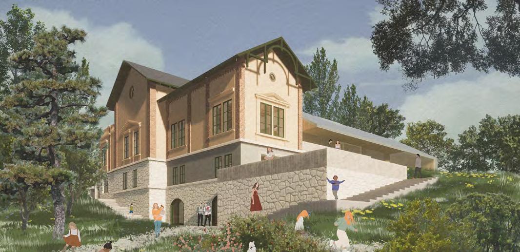 A műemlék átalakítása során az épület értékeit nem a megjelenés korhű megőrzésében, hanem a villaépület hajdan jól működő térhasználatában határoztuk meg. A gyermek-otthonná alakítás során elvesztett fedett-nyitott tér visszaemelése az aktív tanulás, a kertben folyó fenntarthatóságra nevelés és erdőpedagógia helyszíneit bővíti ki. Az oktatási program a természethez és a nomád életmódhoz közelítést, kézművességet és a szabad játékot helyezi a fókuszba. Az erdei iskolát egy szabadon kibérelhető, zarándoknak, kirándulóknak, csoportoknak dedikált hozzáépítés egészíti ki, ami a terület közelében haladó túraútvonalak felé nyit. A különböző célcsoportok igényeihez illeszkedő komfortfokozatú szálláshelyek rendelődnek, amik szabadon hagyják az épületegyüttes diverz felhasználásának lehetőségét. A városi kirándulókat elkülönülő kültéri közösségi hely, bivakolási lehetőség szólíthatja meg, amire a telek felső, az erdőnek átadott területe szolgál.