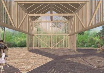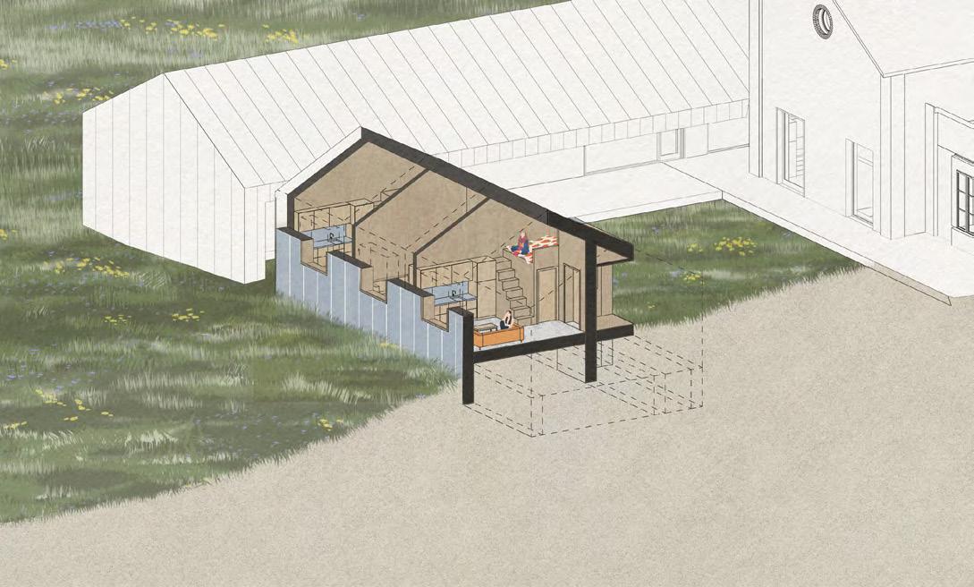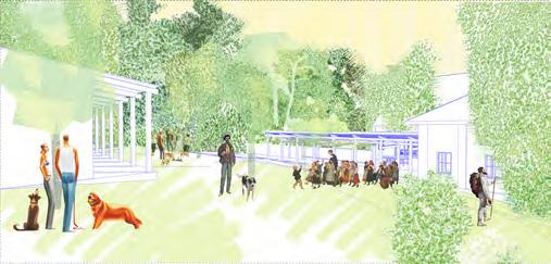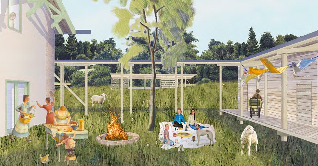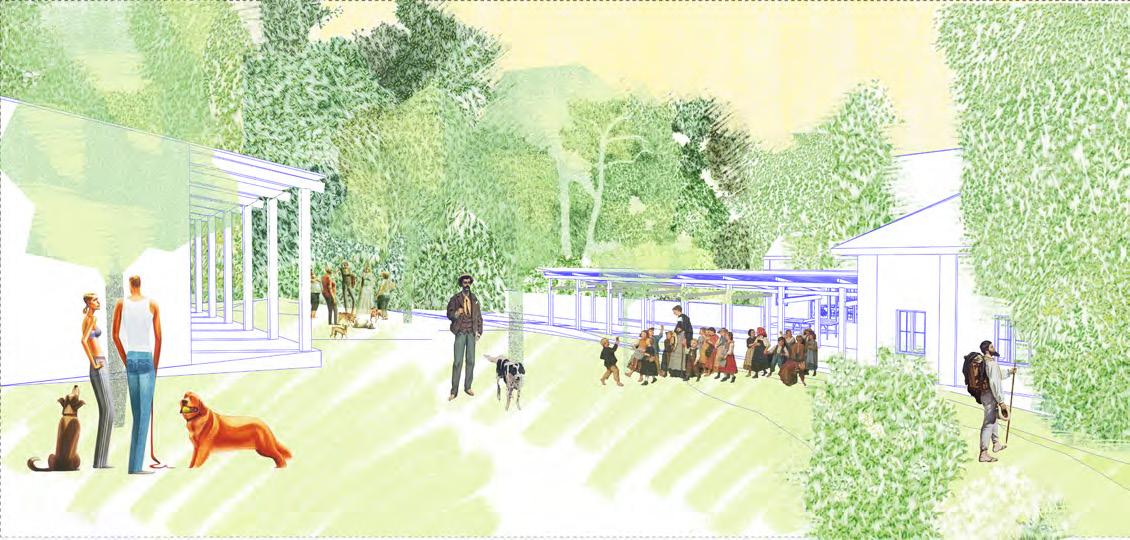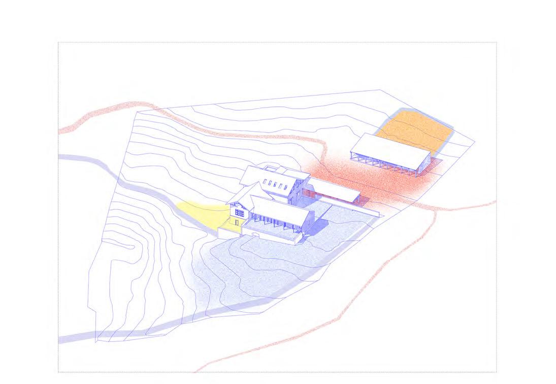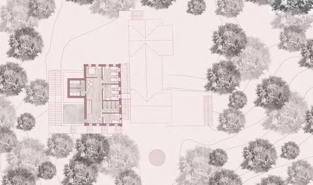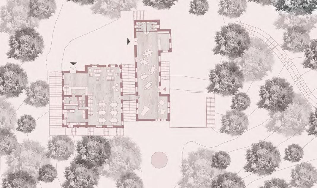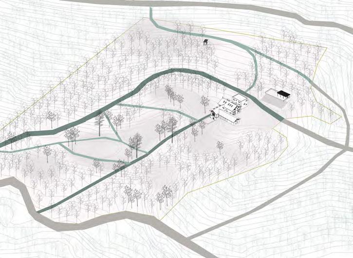 A terv, a program kapott elemein túl, olyan rentábilis funkció (kutyanapközi) beemelésére tesz javaslatot, mely képes egész évben élettel megtölteni a területet és jól kiegészíti az erdei iskola, nyáron tábor működését. A telket korábban ketté szelő út publikussá tételével a hely feltárul a köz számára, a házhoz tartozó lekerített terület így a telek délkeleti felére korlátozódik. Az így kialakult területet egy fésűszerű sáv választja el és köti össze a külvilággal. A földszint a megérkezésnek és az erdei iskola napközbeni működésének lett dedikálva, a hálótermek az emeleten kaptak helyet. A nyugati szárny előtt megjelenő terasszal a donga boltozatú pince (kerti tároló és esővíz tisztító funkcióval) is az iskolához csatolódott. A zarándokok/turisták az “alagsor” délnyugat felé nyitó cellaszerű hálótermeiben kapnak helyet. A kutyanapközi új épülete az állatok befogadásán túl, vízvételi lehetőséggel és nyilvános mosdóval támogatja a környéken zajló szabadidős tevékenységeket.