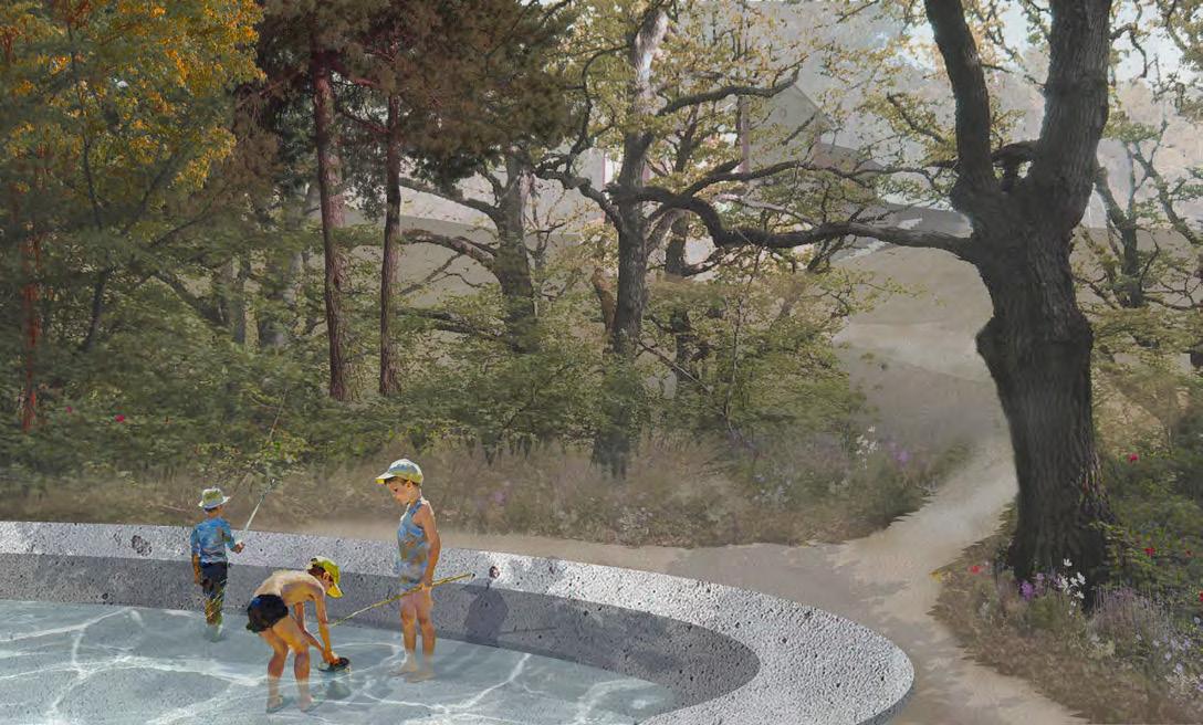 A programom alakítása során a gyerekek edukálására fektettem a fő hangsúlyt, a (napközis) ökoiskola mellett egy turistaszállás is helyet kapott, mely funkciók alkalmanként összeérve erdei iskolaként is használhatók. Ezt a kettősséget és átmenetet tükrözi a kettévágott tömeg és az azokat összekötő híd. A tömegalakítás során a legfontosabb szempont az épület adottságainak megőrzése volt, így a vágáson kívül nem történt nagy beavatkozás. A vágás következtében azonban az épület remek új adottságokra tett szert. A létrejövő két új homlokzat plusz fényt, átlátást és szellőzést biztosít a belső tereknek. A kialakult utca két szintet áthidalva átjárót nyitott a megérkezés terétől a tóhoz vezető úthoz. A régi tó helyére (a meglévő kőfalat részben áttörve) levezettem egy tanösvényt, amely az újonnan létrejövő kisebb tó partján elhelyezkedő kültéri tanterembe vezet. A fenti területen tankert kapott helyet, amivel a gyerekek a növénytermesztésről is tanulhatnak.