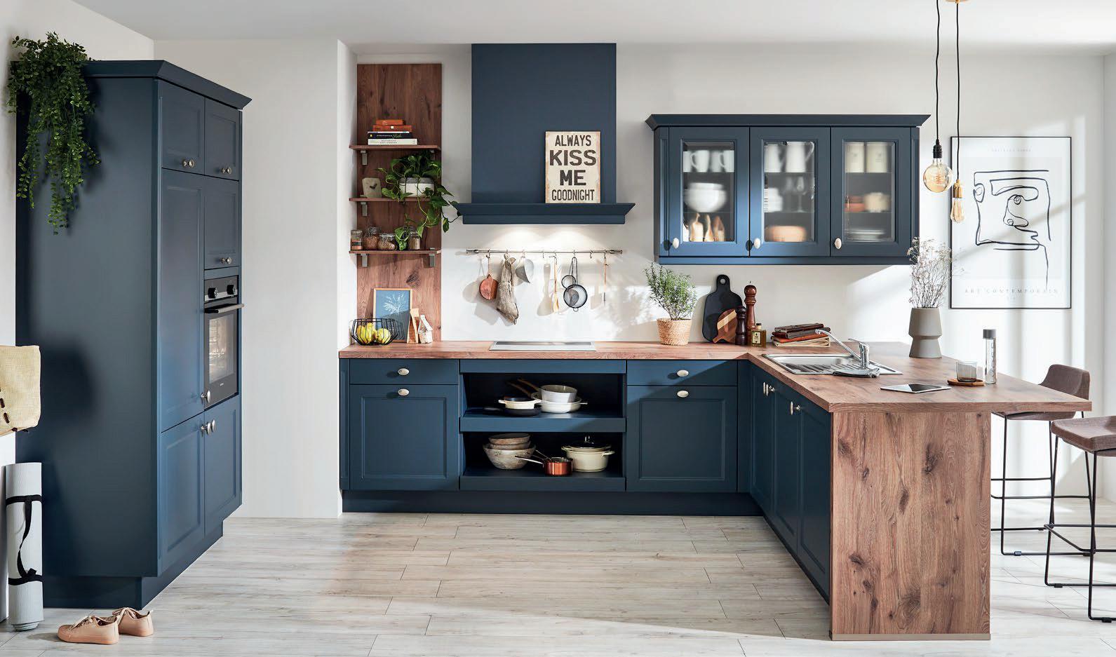 Front Jakota, Lacklaminat, Fjordblau | Korpus in Schiefergrau | Arbeitsplatten in Vikings Oak Nachbildung. Maße ca. 130+280x245 cm.