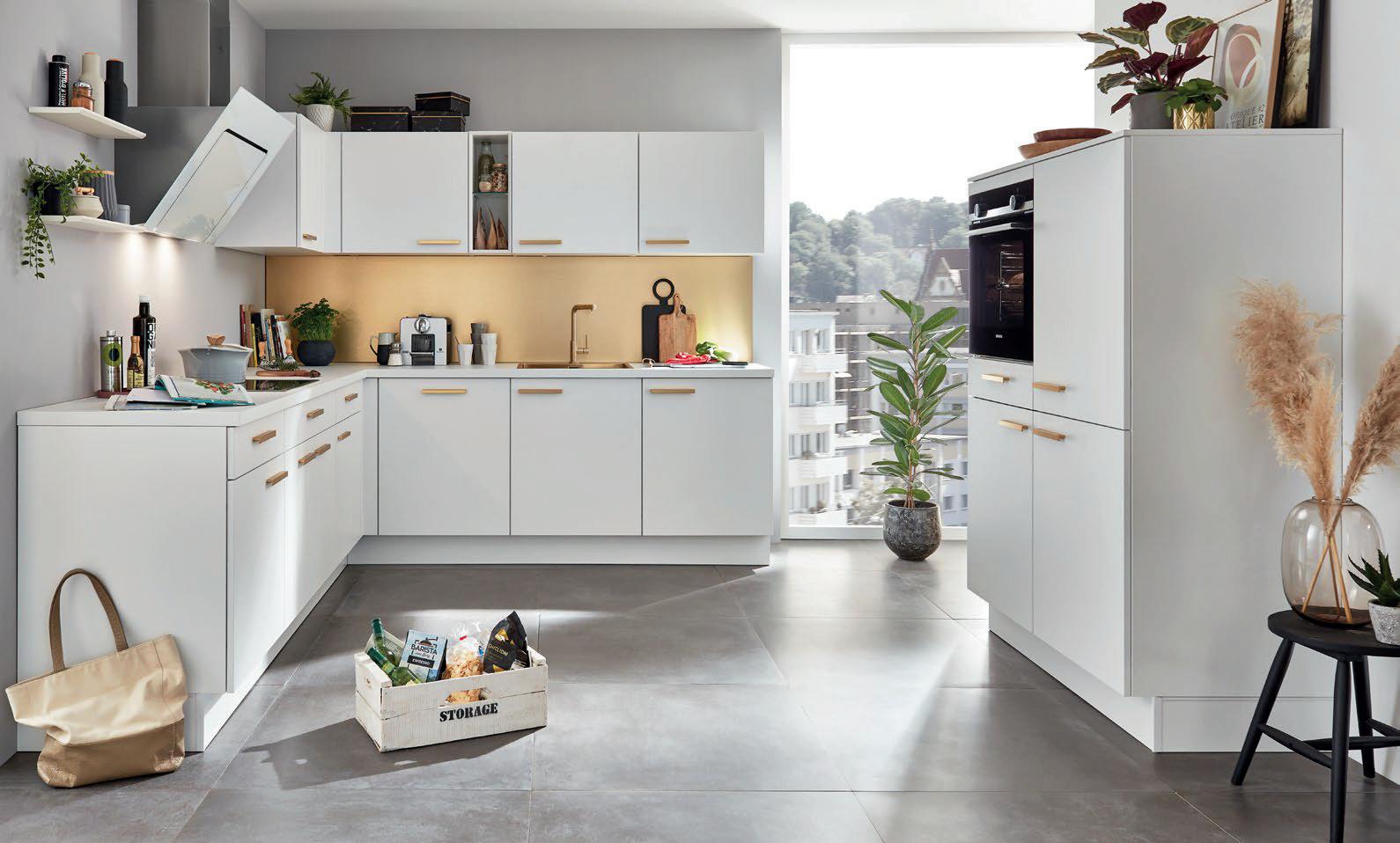 Front Nizza, Alpinweiß ultramatt | Korpus in Alpinweiß | Arbeitsplatten, Ansatztisch und Nischenverkleidung in Taxus Nachbildung. Maße ca. 180x300 cm, Insel ca. 220 cm breit. INKLUSIVE ELEKTROGERÄTE