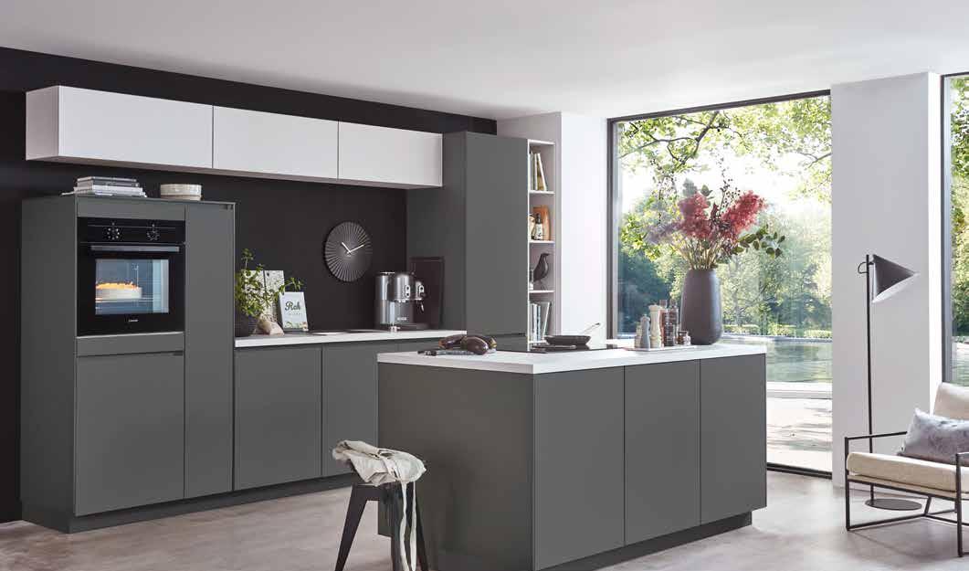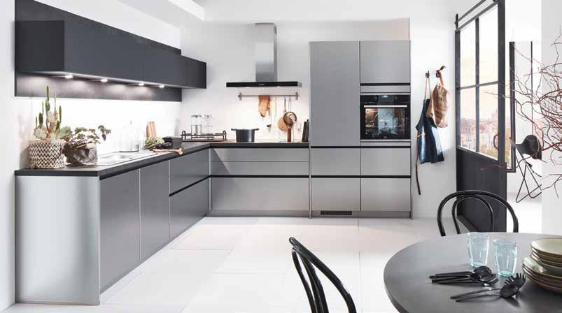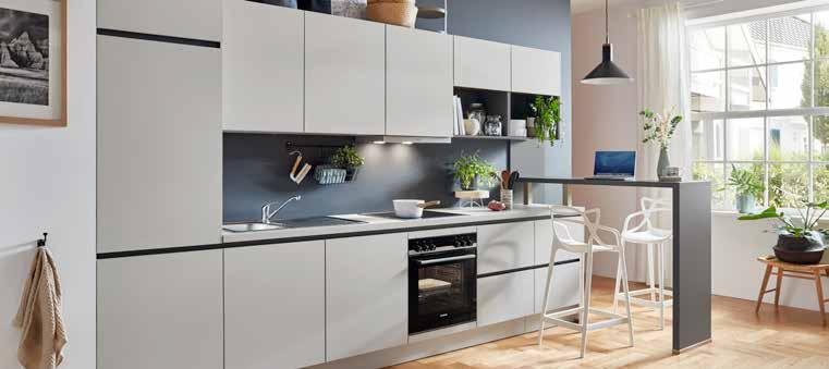 Fronten Wellington, Seidengrau | Arbeitsplatte und Korpus Seidengrau | Thekenansatz Wellington Vulkangrau. Maße ca. 360 cm breit.