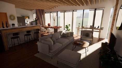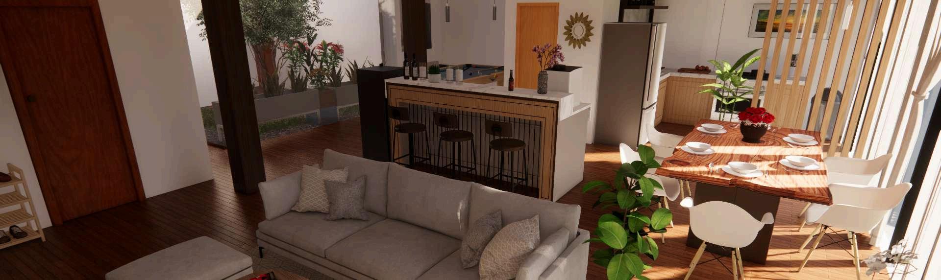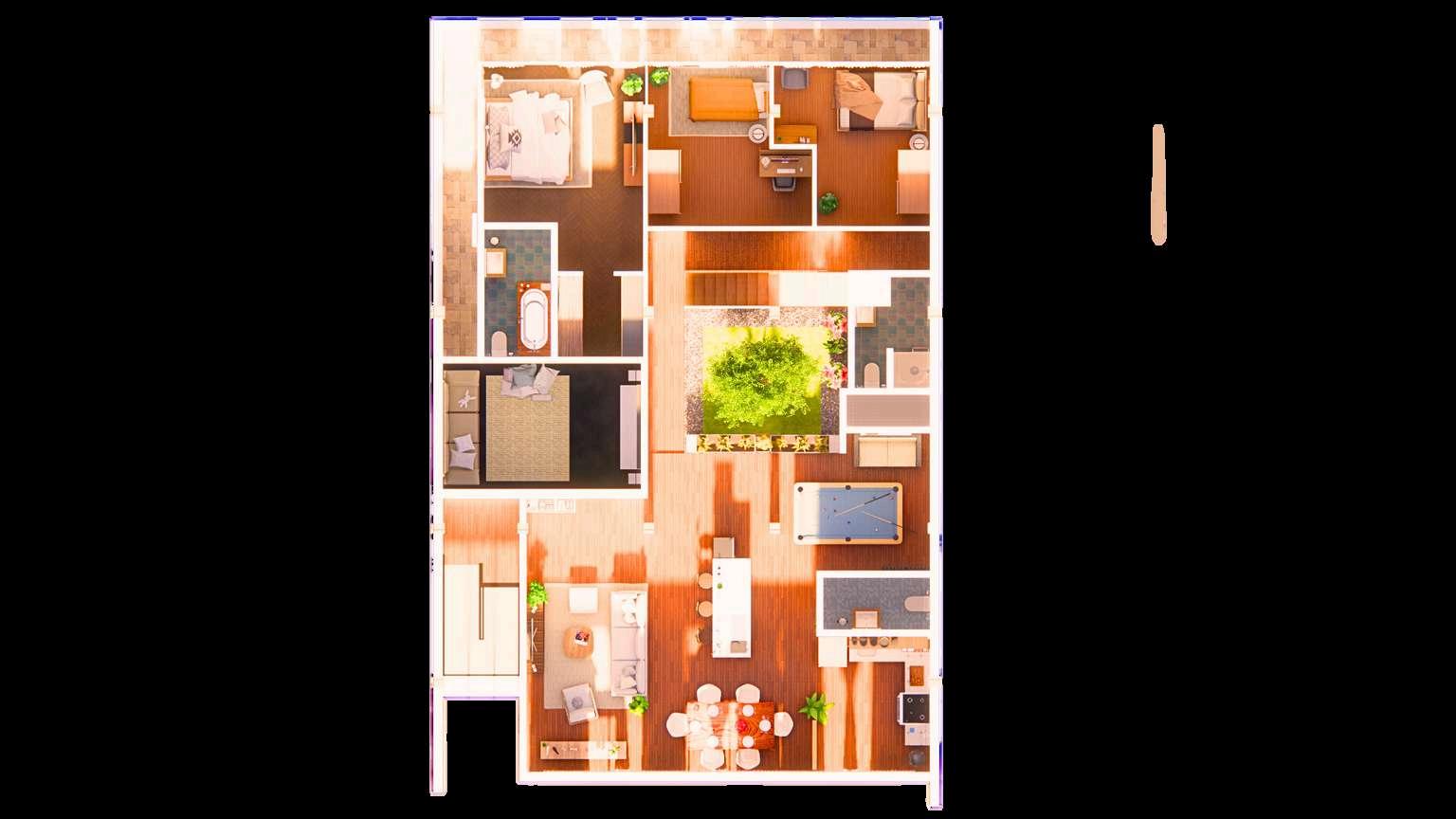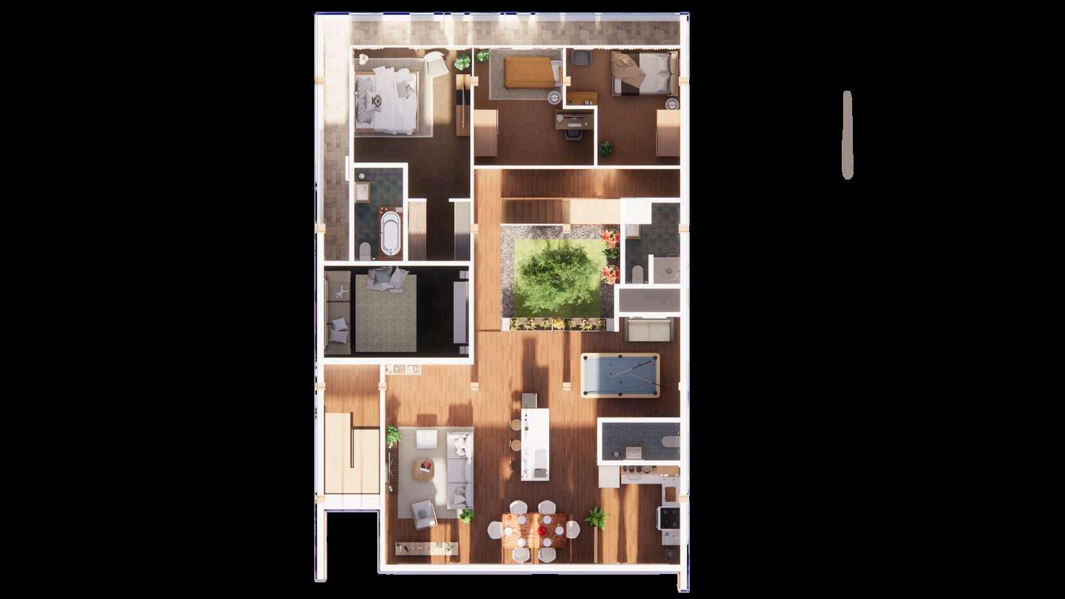 This family Penthouse suite's design concept emphasizes comfort and unity within the family residence. The plan's aesthetic is the Organic Modernism Interior Design Style of the 2000s, combining the layered natural elements of bohemian design with the clean and neutral aesthetic of modern design. Notably, using nature-esque style designs such as succulents and indoor plants, organic wood materials, and neutral painted walls brings out a calm and relaxing aesthetic while integrating nature, which would be an excellent choice for the vacation home.