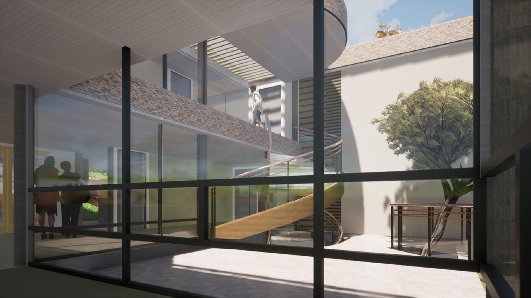 ubicado en el centro del edificio y caracterizado por su doble altura que integra de forma vertical los espacios de permanencia compartidos.