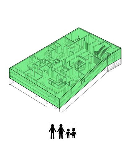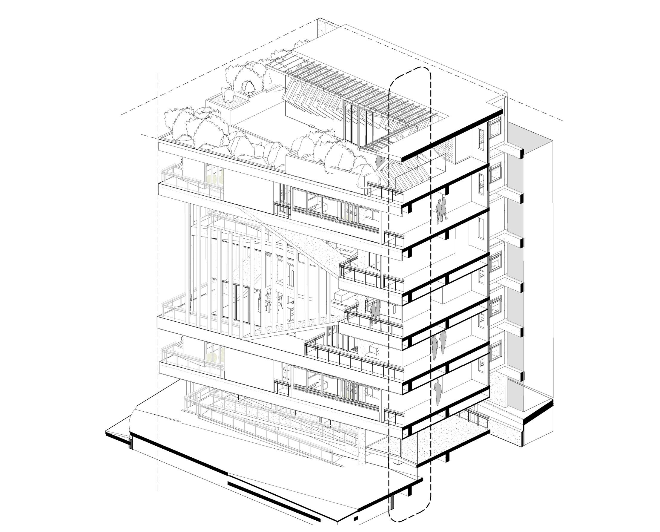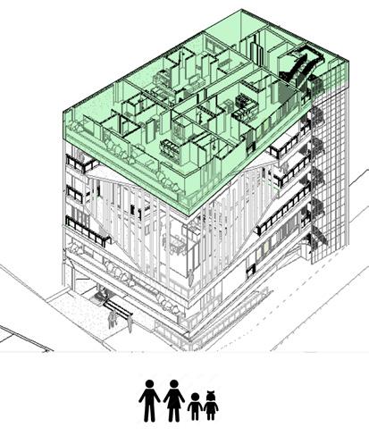 Edificio de vivienda multi familiar que respeta las tipologías existente del entorno construido, e integra las concepciones actuales de vivienda como, coliving, vivienda habitual y de vivienda especial para usuario con reducción de movilidad.
