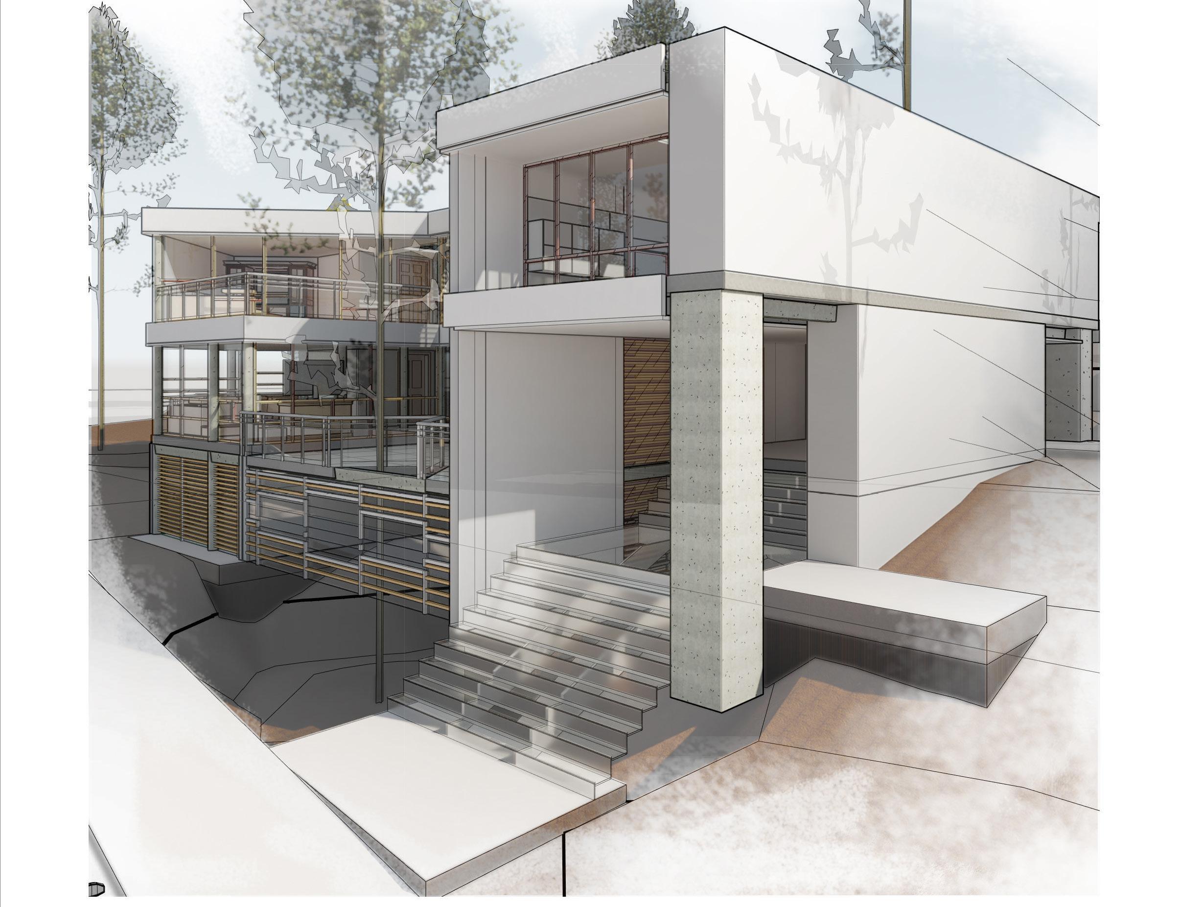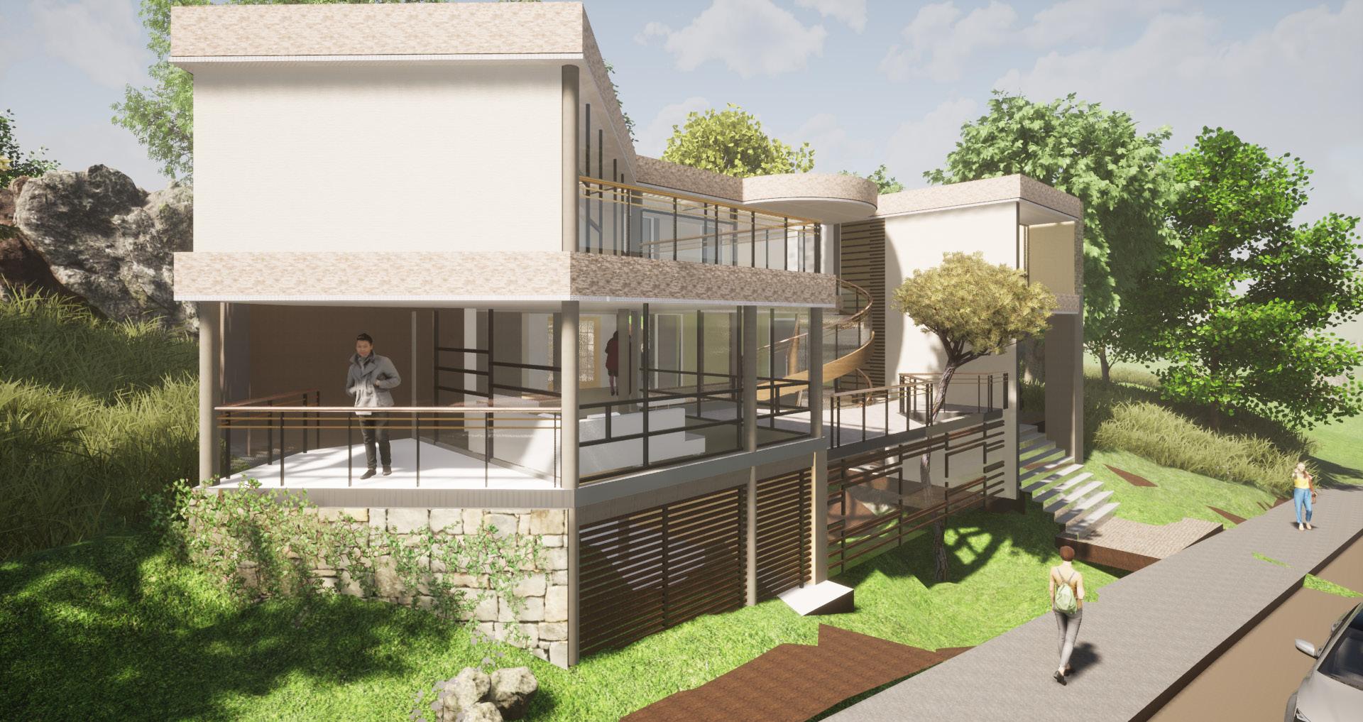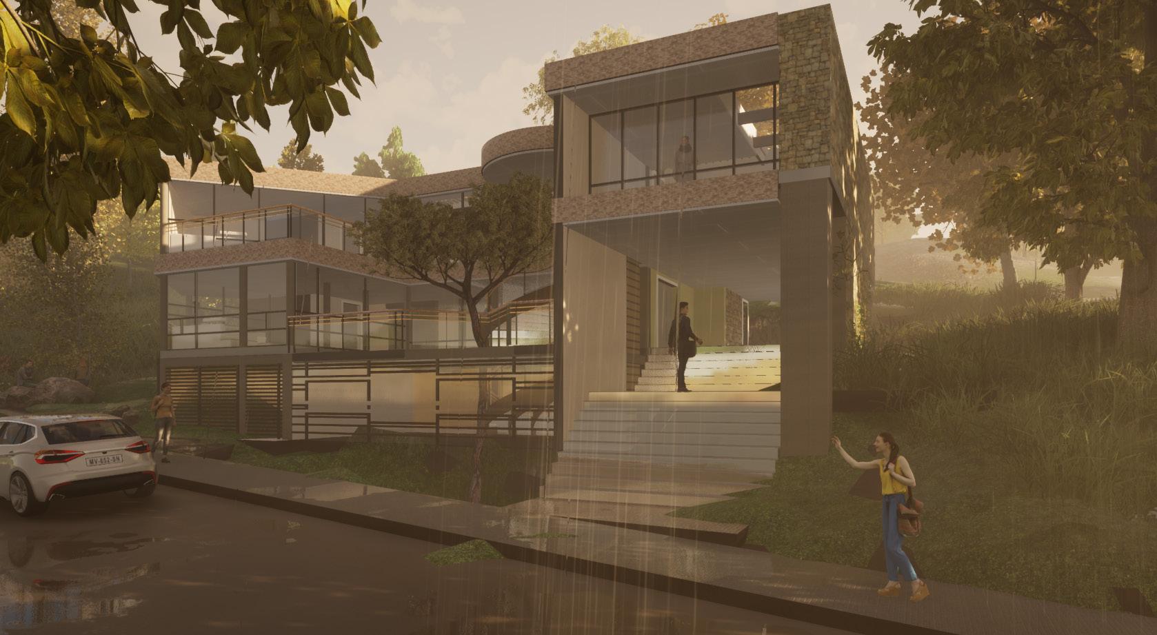 Vista renderizada exponiendo la conexión virtual, por medio de los paneles acristalados y la extensión del volumen por medio de una plataforma vinculando el elemento arquitectónico con su entorno donde se emplaza.