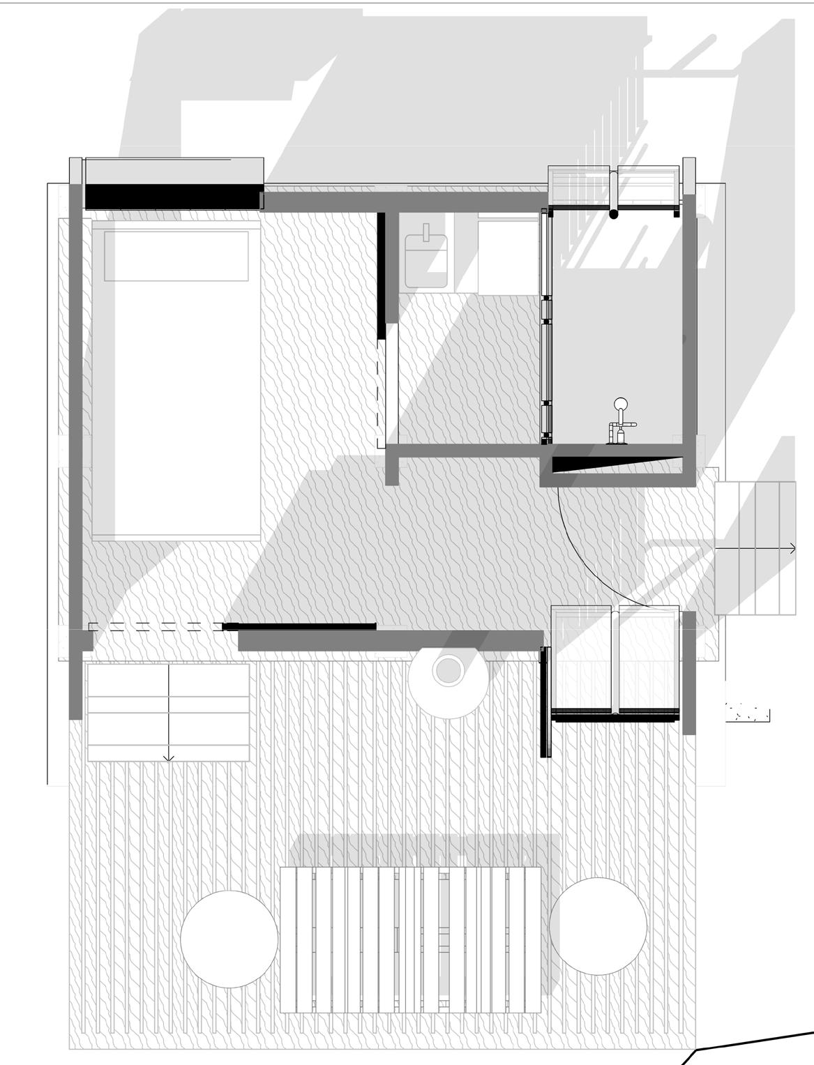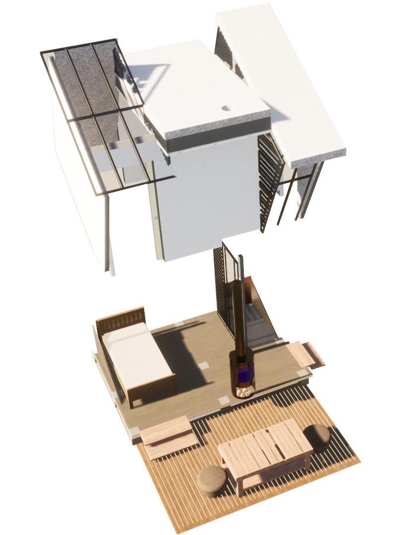 1.- Dormitorio con la capacidad de transformarse en estudio por medio de mobiliario especifico, haciendo así un espacio cambiante según la necesidad.