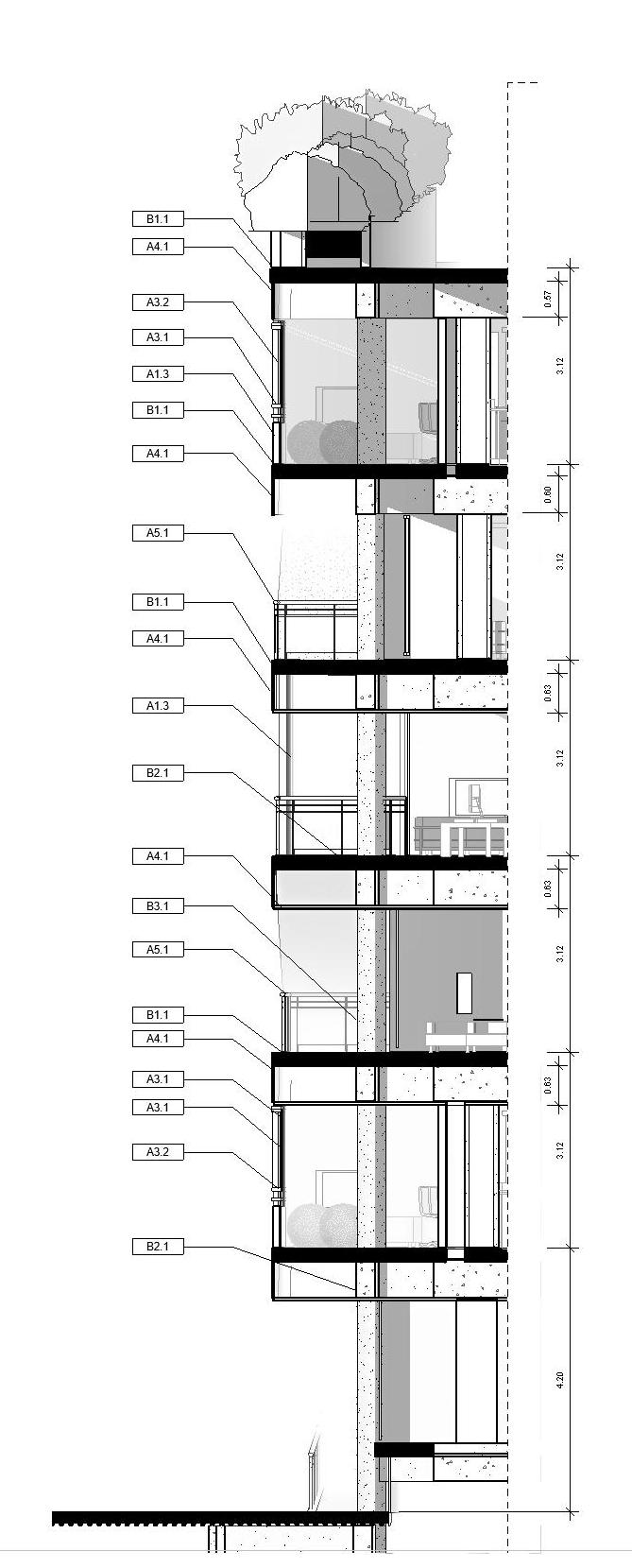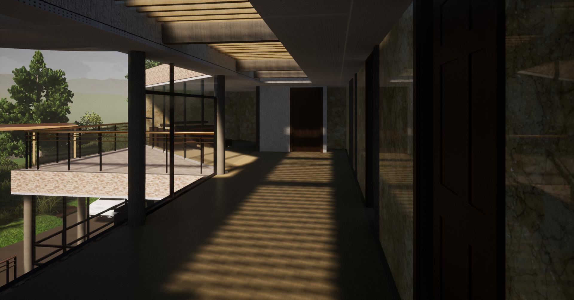 En tanto al diseño del punto fijo,corresponde a la tipología planteada en el lobby creando así, una relación íntima por el uso de materiales que contrastan y actúan como vehículo de iluminación artificial, en el caso del punto fijo; la celosía planteada se presenta como elemento que manipule la luz y la sombra natural generando conexiones entre el interior y exterior del edificio, con esto, se logra mitigar el impacto directo del sol sobre la transparencia superior