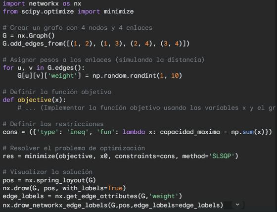Este código crea un grafo simple con 4 nodos y asigna pesos aleatorios a los enlaces. Luego, se define una función objetivo y una restricción simple. Finalmente, se resuelve el problema de optimización y se visualiza la solución.