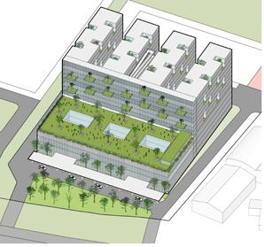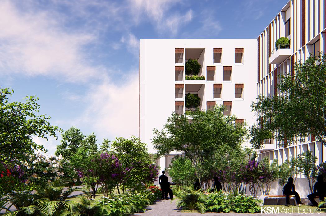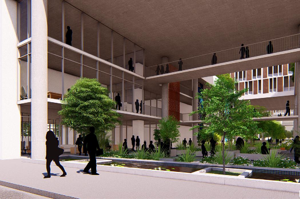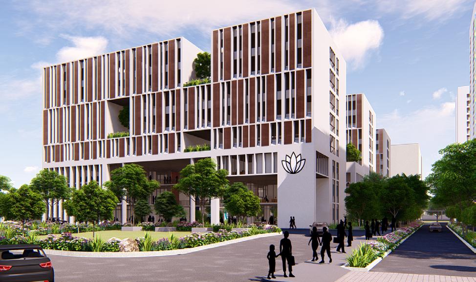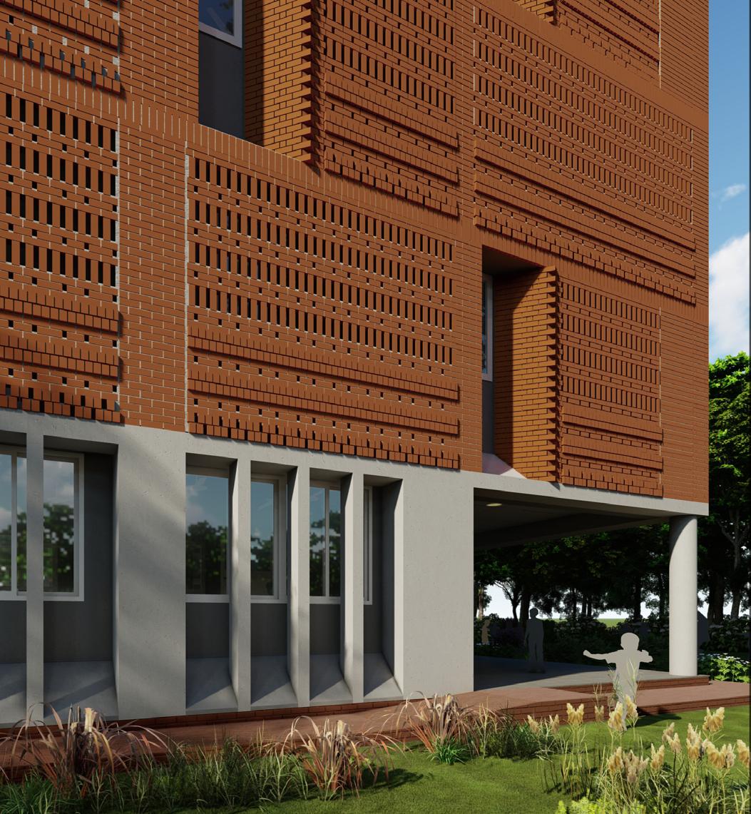 The campus’s masterplanning is not only user-focused but also environmentally conscious. The strategic placement of vertical access cores between towers promotes natural ventilation and lighting, reducing energy consumption. The design features like the GFRC panels on the facade, rainwater harvesting systems, and extensive landscaping on terraces serve to make NMV Medical University a sustainable and eco-friendly institution.