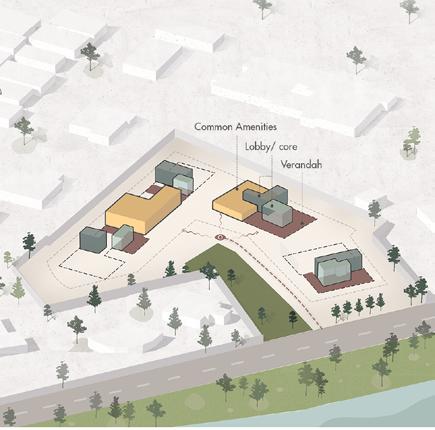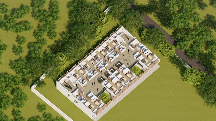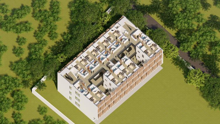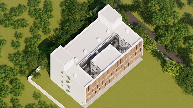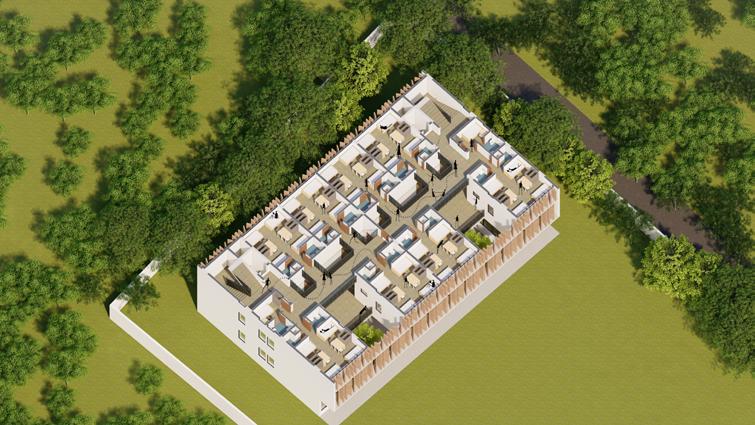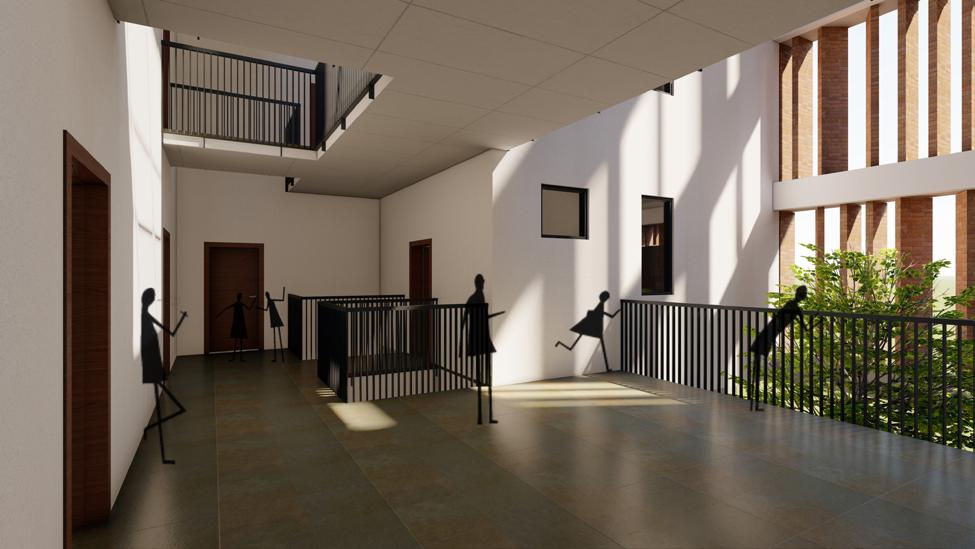Courtyards and verandahs are strategically integrated to enhance ventilation throughout the structure. The ground floor features a spacious covered verandah with two courtyards, providing communal space for students to gather and socialize. The northeast and southeast corners house vertical cores for seamless access between floors. The first, second, and third floors have eight dormitories with attached bathrooms. The floor plate steps back to create a triple-height space topped with a skylight, serving as a lively communal hub.