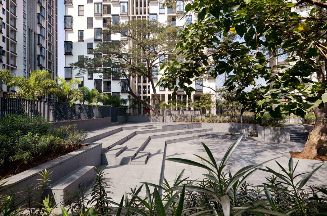 Vehicular access was taken along the Western periphery with distinct drop-off plazas for each tower and the driveway then leading down to the basements for car-parking, thereby restricting the vehicular-pedestrian conflict and giving a more ‘people-friendly’ circulation to the campus. A landscaped driveway is integrated with the large garden at the centre with the provision for vehicular access in the event of an emergency.