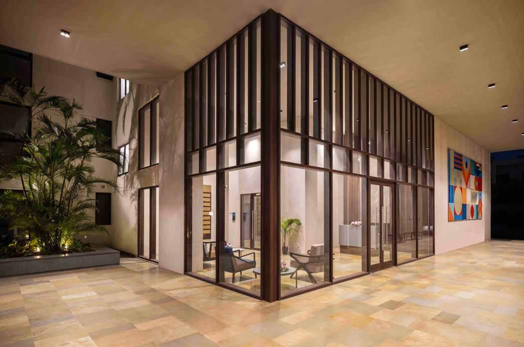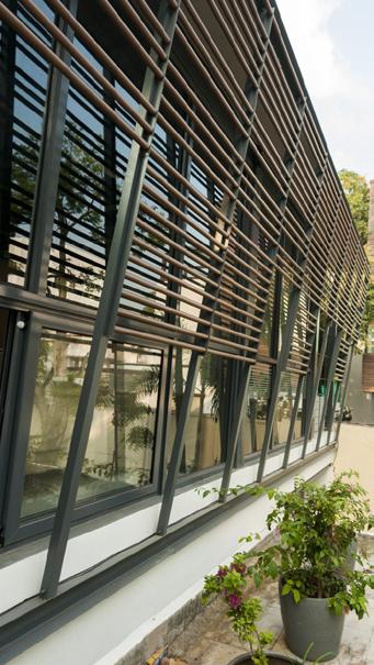 A flight of stairs gracefully ushers visitors to the open office space on the first floor, characterized by full-height glazing that offers sweeping panoramic views. To counter the late afternoon sun, metal grills host a green tapestry of creeping plants, which reduces heat and adds a touch of nature to the ambiance.