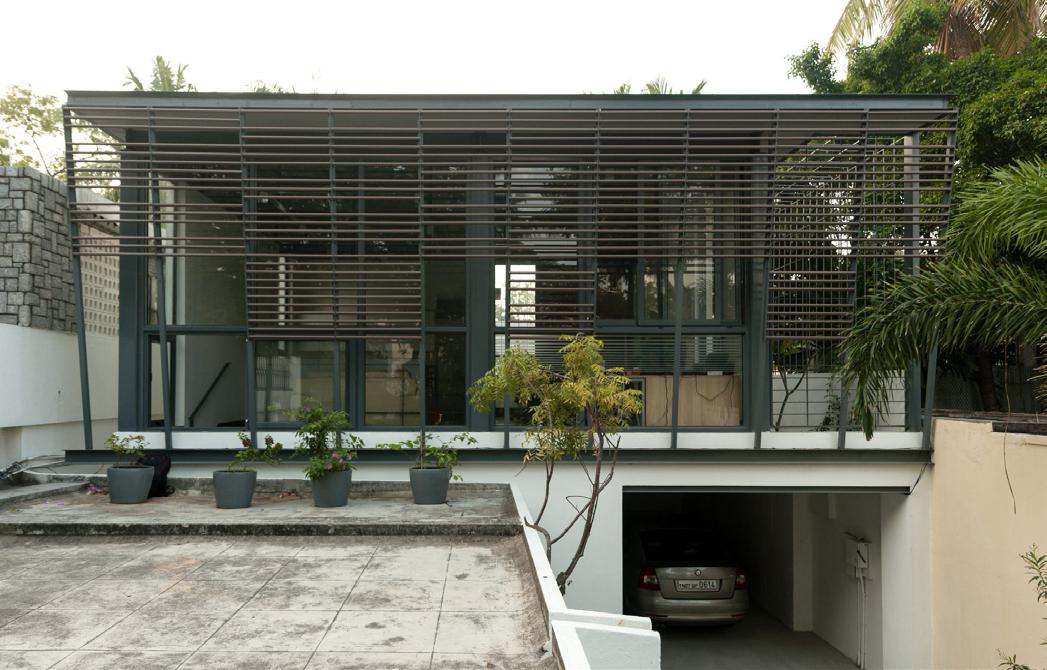 The building faces east-west, which posed challenges in managing natural light and heat. To address this, the design incorporates vertical brick piers that are tilted at intervals. These piers effectively reduce glare, allowing occupants to keep windows open during Cochin’s frequent rains. The piers also add visual interest, creating a sense of movement on an otherwise static facade. The use of locally sourced brick supports sustainable building practices and complements the regional aesthetic.