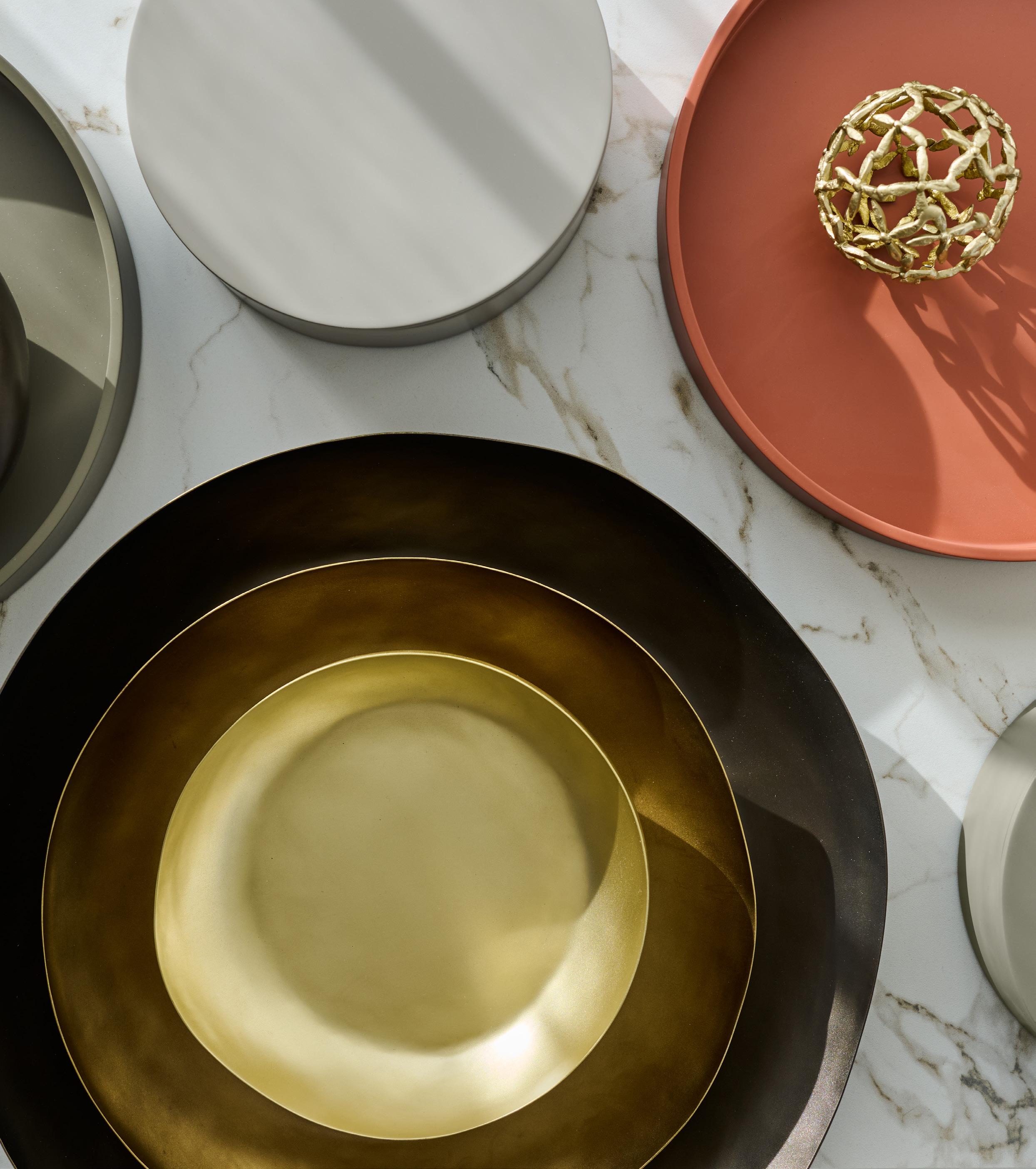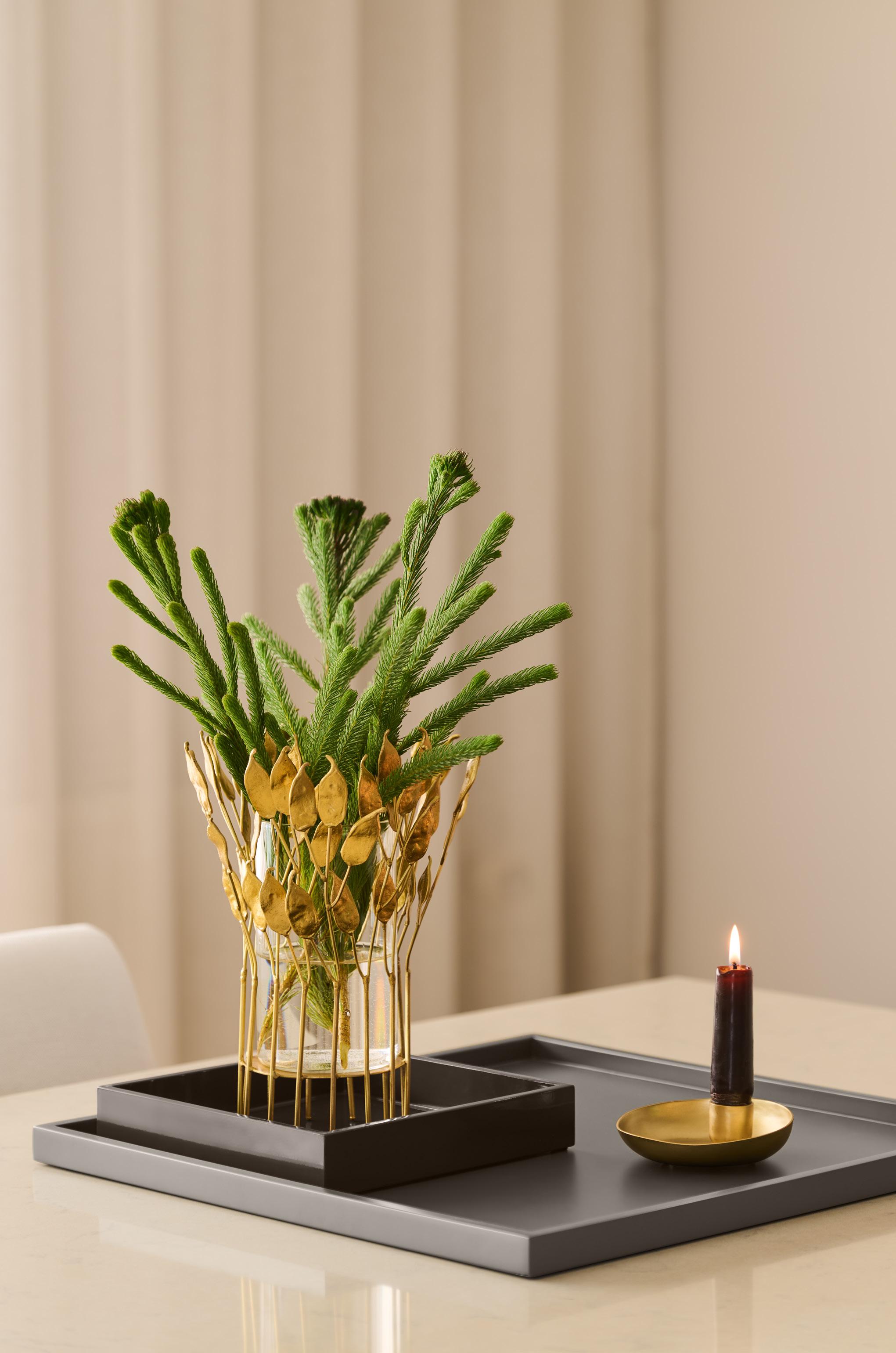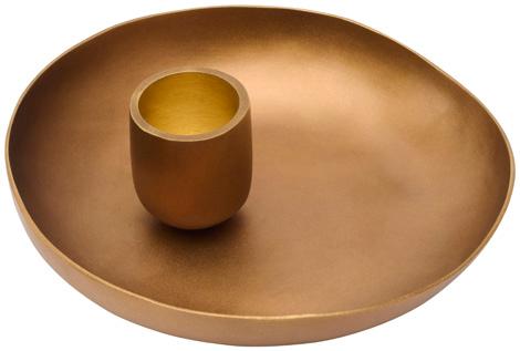 WAVE collection is made by Indian artisans called “Thathera.” The Thathera community has been making traditional tools in India by hammering flat brass sheets by hand. After shaping, all finishing is done by hand. The waste from the brass sheets is recycled into IXORA flowers and PEA PODS.