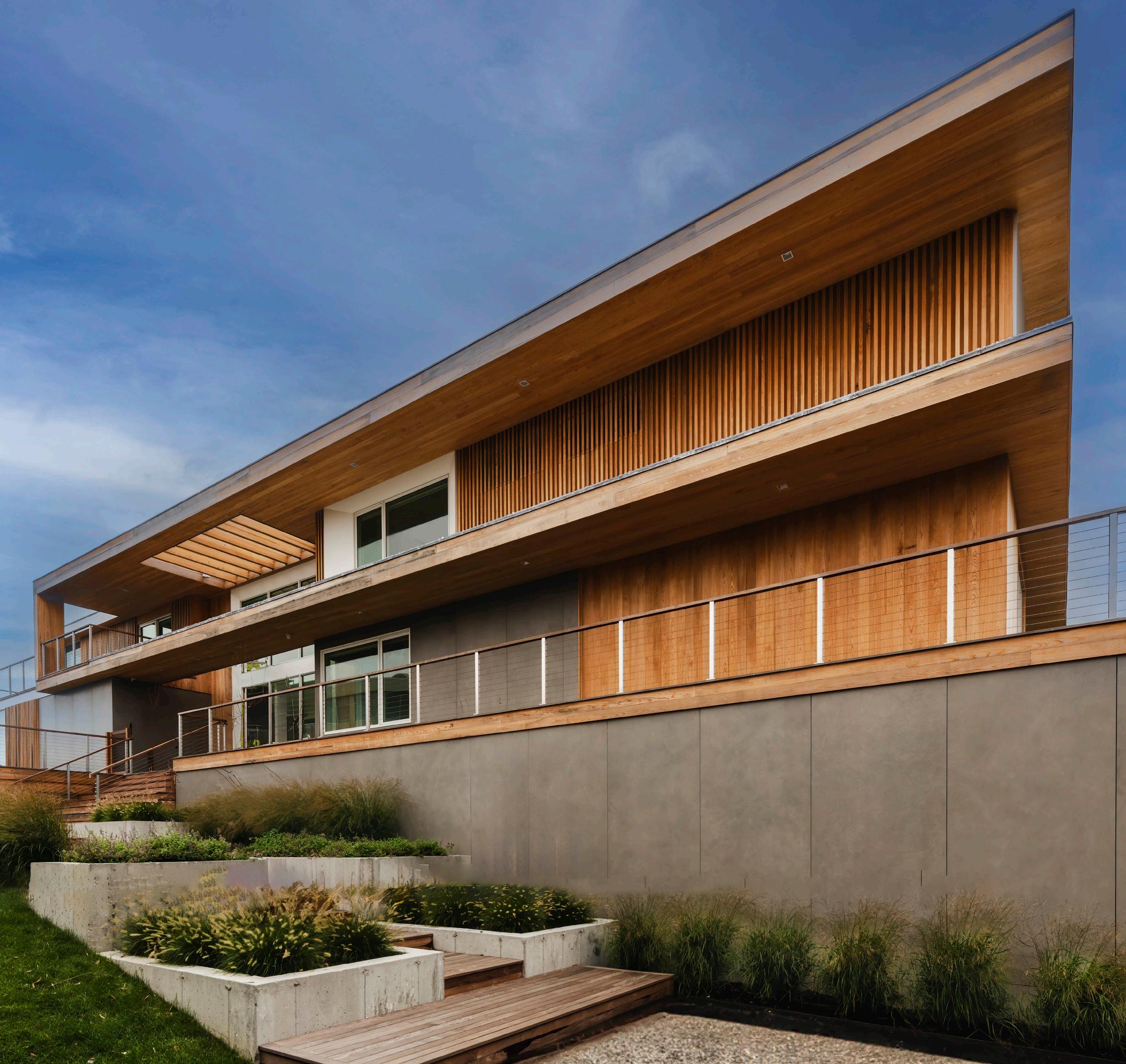 The clean lines and geometric shapes define the exterior façade, creating a visually captivating presence against the backdrop of the surrounding landscape. Warm-toned wooden slats adorn the exterior, imparting a sense of warmth and natural beauty to the structure. These wooden elements contrast harmoniously with the sturdy concrete blocks that form the foundation and lower levels of the house, adding a modern touch to the overall design.
