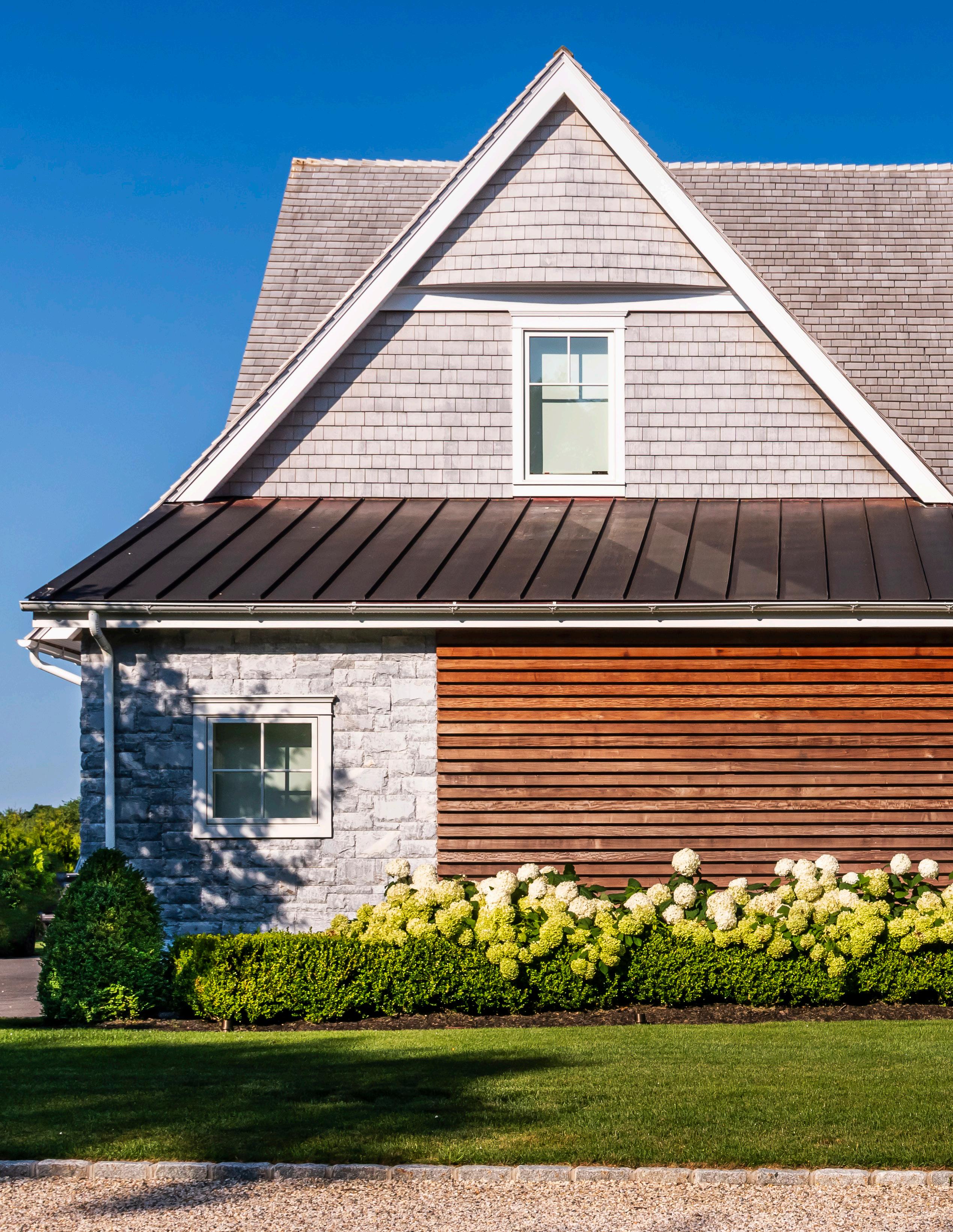 Aesthetically, the visual nature of the house was entirely re-imagined. The Victorian detailing and blue shingle siding were replaced with nickel-gap cedar plank siding, with lead-coated copper roofing and detailing throughout – a clean new style marrying Hamptons modern with city industrial. Oversized windows were screened with slatted cedar panels to maintain privacy and control light. The interiors maintain this new aesthetic but with a softer approach. Light-colored oak cladded all primary walls, blueveined stone highlights the kitchen, and a starkly modern furniture palette caps off this beautiful new modern getaway.