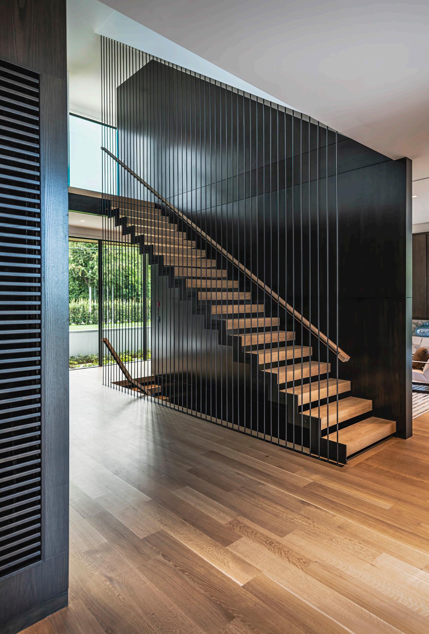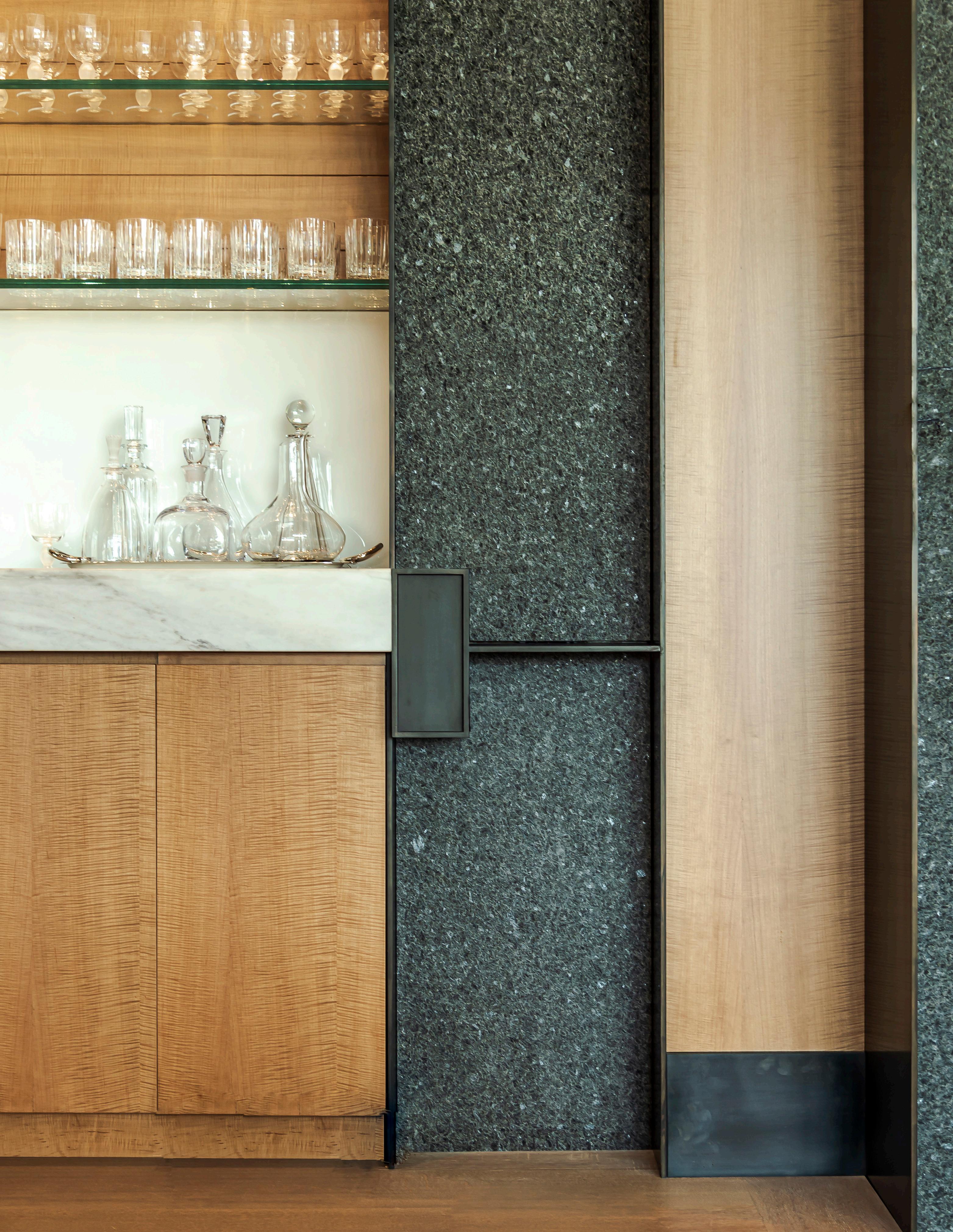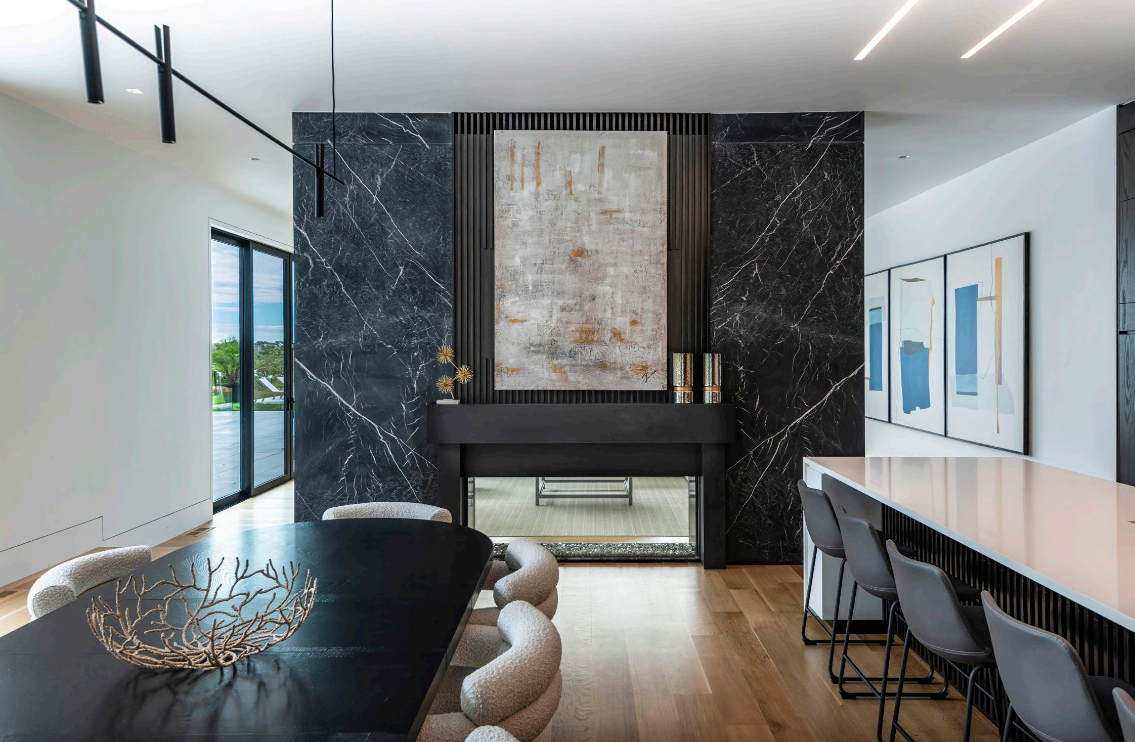 Here, Mojo Stumer employs a careful selection of materials and textures to create a dynamic visual experience. Horizontal wood paneling, complemented by blackened steel detailing, adds depth and contrast, while dark stone slabs lend a sense of solidity. The strategic use of white surfaces introduces brightness and balance, enhancing the interplay of light and shadow. The meticulous attention to spatial dynamics set the Watermill home apart. The ceiling, with its varied heights and intricate detailing, showcases Mojo Stumer’s innovative approach to design. Quarter-cut maple, thoughtfully integrated throughout, mirrors the bespoke rift white oak flooring, establishing a cohesive design language that ties the entire residence together.