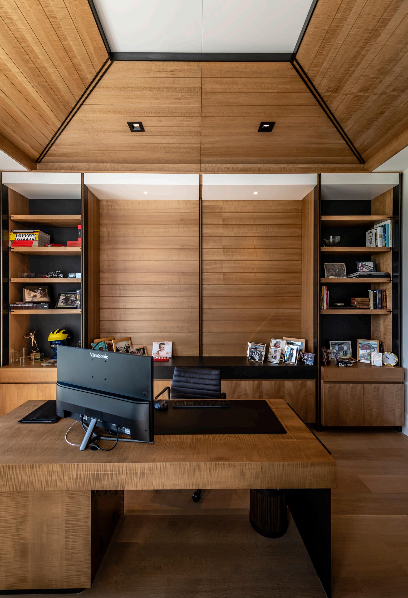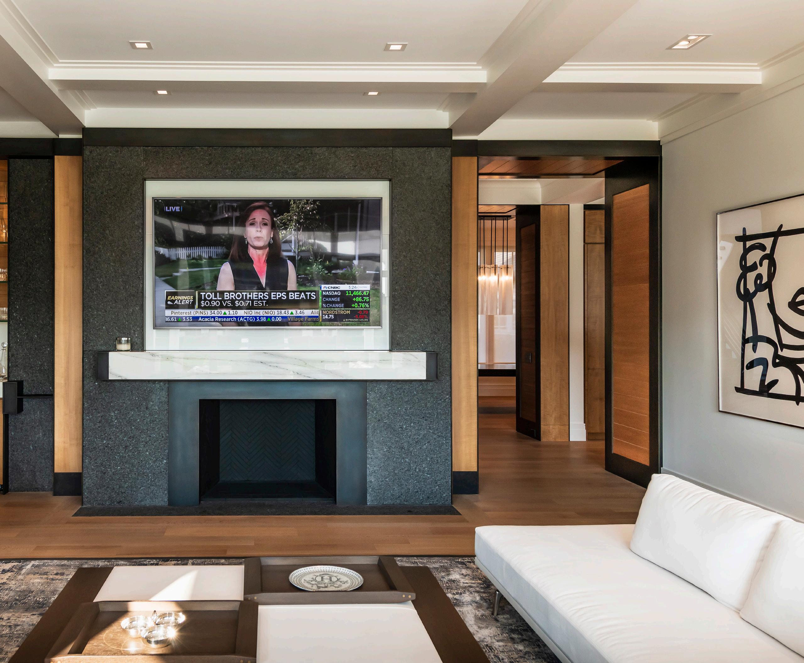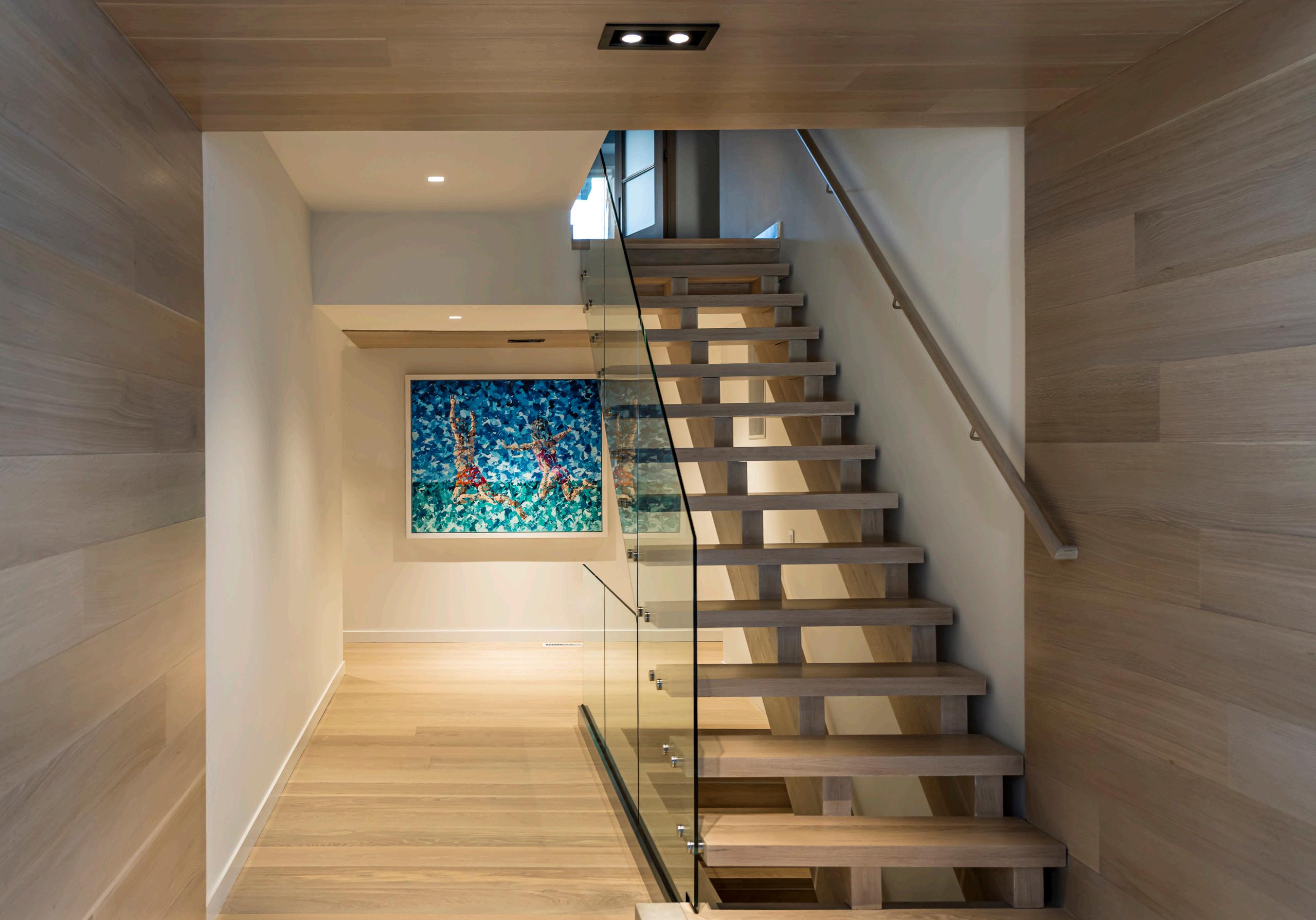 Here, Mojo Stumer employs a careful selection of materials and textures to create a dynamic visual experience. Horizontal wood paneling, complemented by blackened steel detailing, adds depth and contrast, while dark stone slabs lend a sense of solidity. The strategic use of white surfaces introduces brightness and balance, enhancing the interplay of light and shadow. The meticulous attention to spatial dynamics set the Watermill home apart. The ceiling, with its varied heights and intricate detailing, showcases Mojo Stumer’s innovative approach to design. Quarter-cut maple, thoughtfully integrated throughout, mirrors the bespoke rift white oak flooring, establishing a cohesive design language that ties the entire residence together.