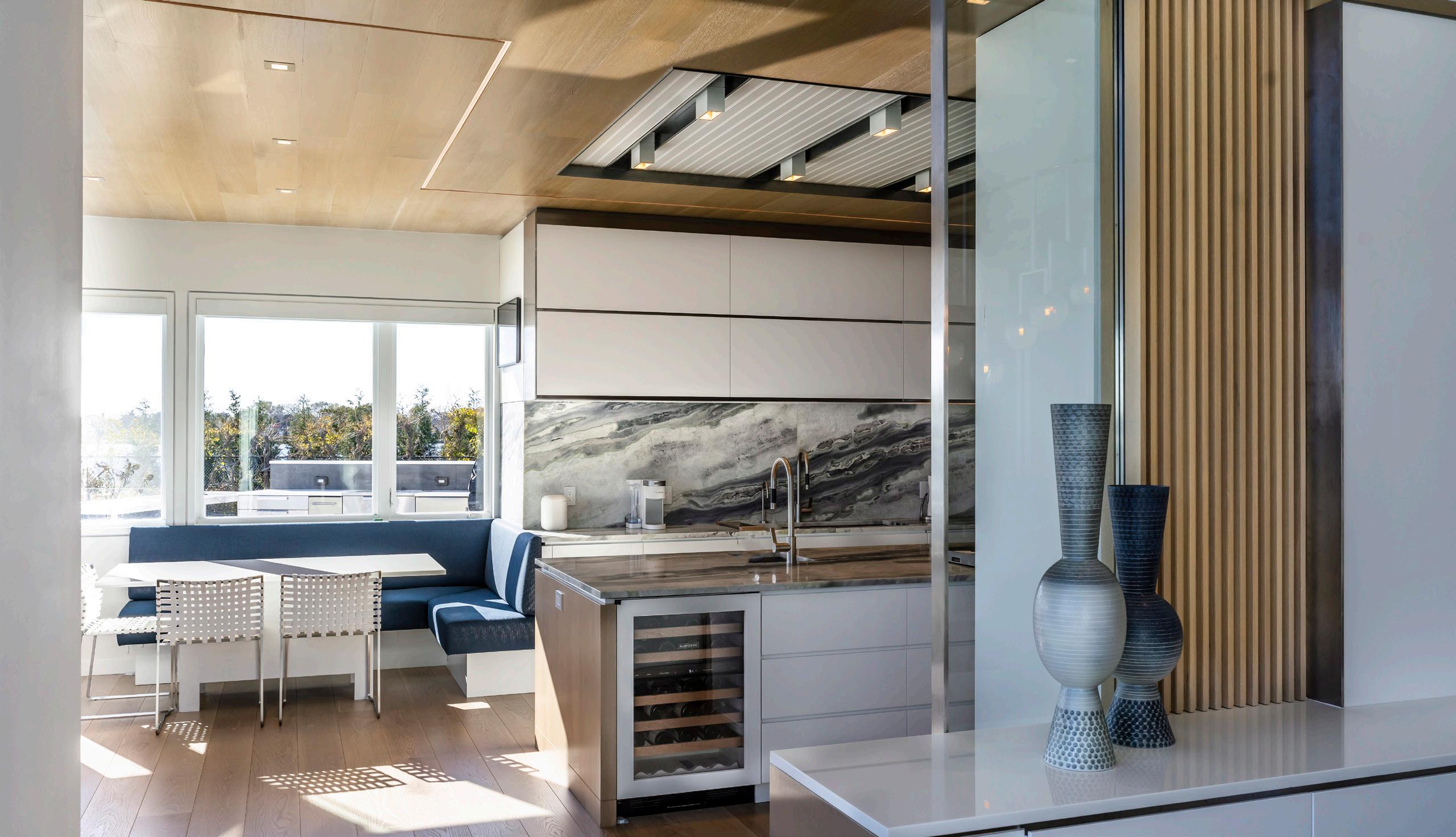 The renovation of this 1960s Hamptons cottage overlooking Quantuck Bay in Westhampton Beach was initially intended to simply improve and modernize the summer vacation home and elevate its very traditional functionality and aesthetic to meet the owner’s more modern lifestyle. When COVID-19 lockdowns hit at the early stages of construction, the NYCbased owners re-evaluated their needs and re-directed the renovation to instead create a family-compound style getaway, capable of housing extended family and guests for long periods of escape from city life.
