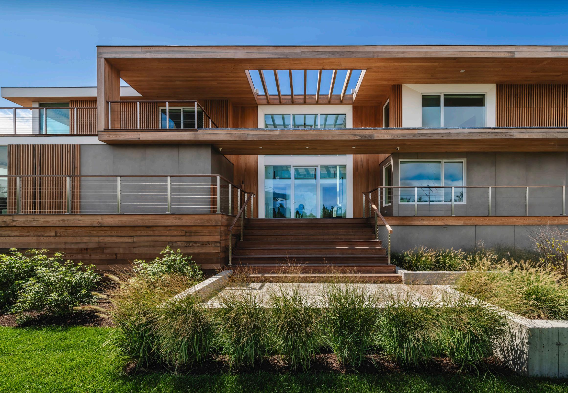 This new oceanfront home is carefully designed to navigate the area’s challenging site and flooding restrictions. The architectural team leveraged these challenges, creating a beautiful home. Dune Road House features a geometric roof, which extends into the outdoor patio and surrounds the house. This design feature offers panoramic views of the landscape. This elevated platform serves as an extension of the living space, providing an ideal setting for outdoor gatherings, relaxation, and appreciation of the natural beauty that surrounds the house.