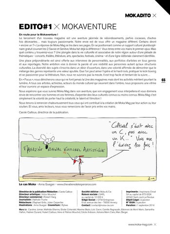 En route pour la Mokaventure ! Le lancement d’un nouveau magazine est une aventure jalonnée de rebondissements, parfois cocasses, d’autres fois décevantes… mais toujours passionnante. Notre envie est de vous offrir un magazine différent. Certains diront « encore un ? ». La réponse de Moka Mag se lira dans ses pages. En se positionnant comme un support culturel pluridisciplinaire gratuit couvrant les 2 Savoie et Genève, Moka fait déjà la différence ! Vous tenez entre vos mains le premier opus. Mais quel contenu y trouverez-vous ? Une plongée dans la vie culturelle et associative de notre région autour d’une pléiade de thématiques - concerts, théâtre, littérature, arts, spectacles, festivals, cinéma - et d’une ligne éditoriale clairement identifiée. Une place prépondérante est ainsi offerte aux interviews de personnalités, aux portfolios d’artistes en tous genres et aux reportages. Notre ambition vise à donner la parole et une visibilité aux personnes autant qu’aux structures culturelles. La diversité des sujets s’inscrira dans un désir d’ouverture, dans une volonté affirmée de démontrer que le mélange des genres représente une valeur ajoutée. Que l’on peut aimer l’opéra et le hard-rock, pratiquer le kick-boxing et se passionner pour la littérature. Non, nous ne suivrons pas la meute. Il est trop facile et tentant de la suivre… En « Focus », nous dénicherons ceux qui ne font jamais la Une des magazines mais dont les activités méritent pourtant la lumière. A tous ces artistes, activistes, acteurs du monde culturel qui oeuvrent dans l’ombre, nous proposons une vitrine et leur ouvrons un espace d’expression. Nous espérons que vous suivrez Moka Mag dans son aventure, que son engagement vous interpellera et vous donnera envie de rencontrer ces hommes et ces femmes, d’arpenter des lieux culturels connus ou moins connus. Moka Mag c’est simplement la volonté de porter haut la créativité, le talent et l’émotion ! Nous tenons à remercier chaleureusement tous ceux qui ont contribué à la création de Moka Mag par leur action ou leur soutien. Et vous, amis lecteurs, nous vous remercions de l’avoir pris entre vos mains. Carole Cailloux, directrice de la publication.