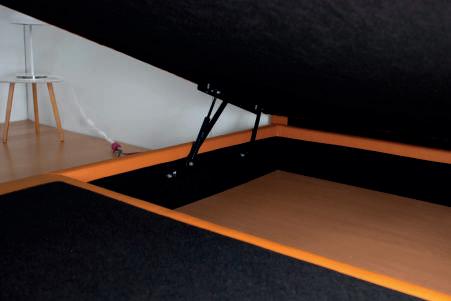 S P A PT ENFREstrutura de metal Tampa elevatória com réguas de madeira (fundo em cor cerejeira e tampo em TNT preto) Gaveta frontal em melamina de cor banca com rodas ao chão Metal structure Lift cover with wooden bed slats (cherry colour bed bottom and 3D black fabric top) White melamine front drawer with wheels on the floor Structure métallique Couvercle relevable avec lattes de bois (fond en couleur cerise et dessus en non tissu couleur noir) Tiroir avant en mélaminé couleur blanc avec roulettes au sol 190 / 200 63 22 18 90 / 140 / 150 / 160 / 180 Video