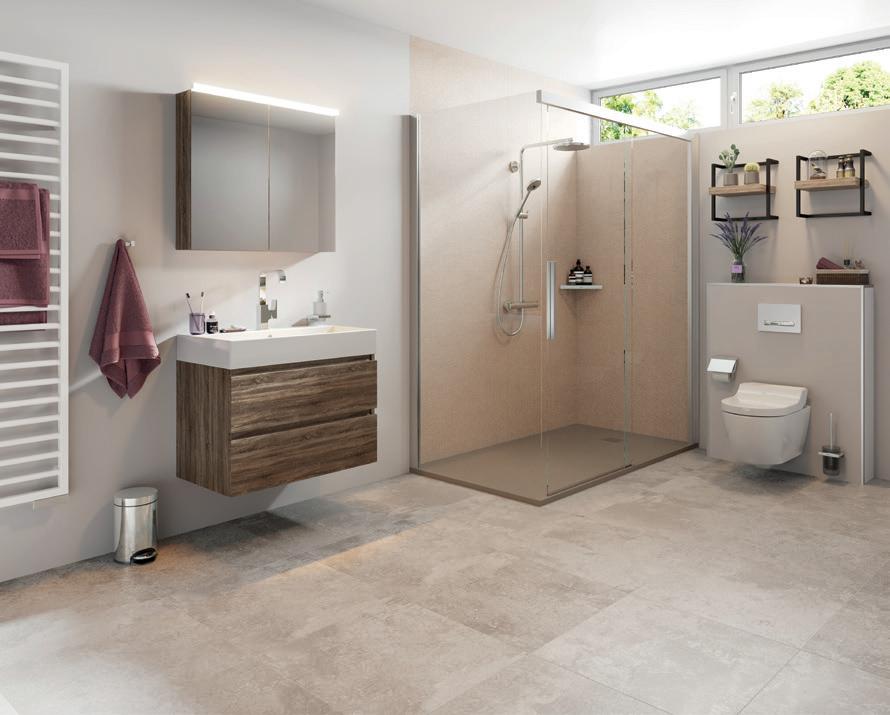 Een complete badkamerrenovatie doen we in 4 tot 5 dagen. Inclusief stijlvolle vloer- en wandpanelen, moderne meubels en luxe extra’s zoals een Sunshower of warmtepaneel.