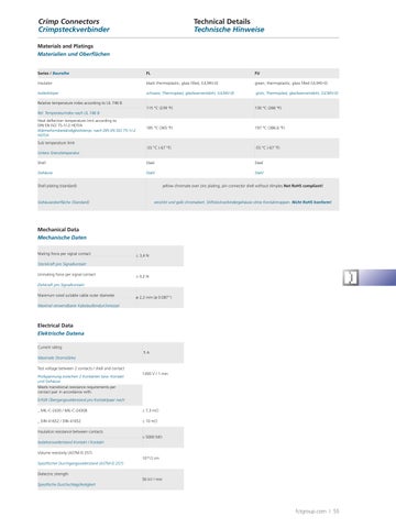 Alle FCT Steckverbinder (inkl. THT, SMT und Crimp-Versionen) sind in vielen verschiedenen Material- und Oberflächenkombinationen erhältlich. So z.B. Gehäuse in nichtmagnetischer Ausführung aus Messing bzw. chemisch vernickelt. Für Luft- und Raumfahrtanwendungen sowie für die Medizinund Messtechnik sind vergoldete Gehäuse verfügbar.