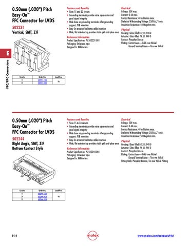 Features and Benefits • Sizes 15 to 33 circuits • Grounding terminals provide noise suppression and good signal integrity • Wide base on grounding terminals offer grounding support, PCB retention • Easy-On actuator facilitates cable insertion • Wide, flat actuator top provides stable pick-and-place area