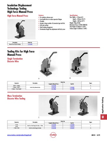 Features • For medium-volume users • Low handle force to reduce operator fatigue • Portable • Accepts a large number of connector-type tool kits • Full-cycle ratchet • Quick tooling changeover • Termination height fine adjustment with lock screw