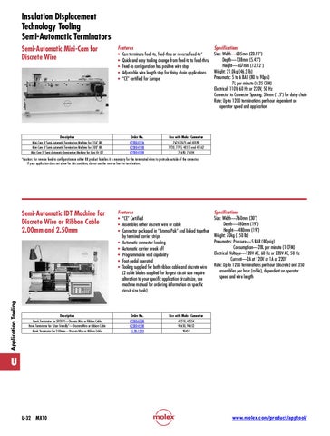 Features • “CE” Certified • Assembles either discrete wire or cable • Connector packaged in “Ammo-Pak” and linked together by terminal carrier strips • Automatic connector loading • Automatic carrier break off • Programmable void capability • Foot-pedal operated • Tooling supplied for both ribbon cable and discrete wire (2 cable blades supplied for largest circuit size require alteration to your specific application circuit size, see machine manual for ordering information on specific circuit size tools)