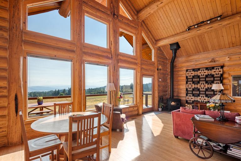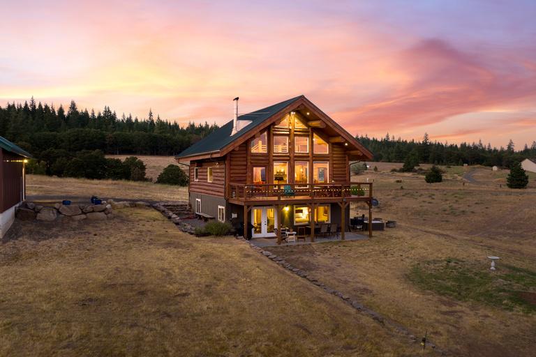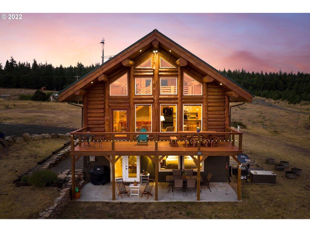 Public: Serene log home nestled on 9.95 acres with detached oversized garage in wonderful small community. Thoughtfully placed with stunning views of Mt. Hood this well maintained property features high grade materials with quality nishes making it easy to enjoy. The cozy layout o ers space for privacy and re ection while also providing a large open living and dining room with mesmerizing views. Noteworthy are two state of the art Jotul stoves and a 10,000 watt push button back up generator.